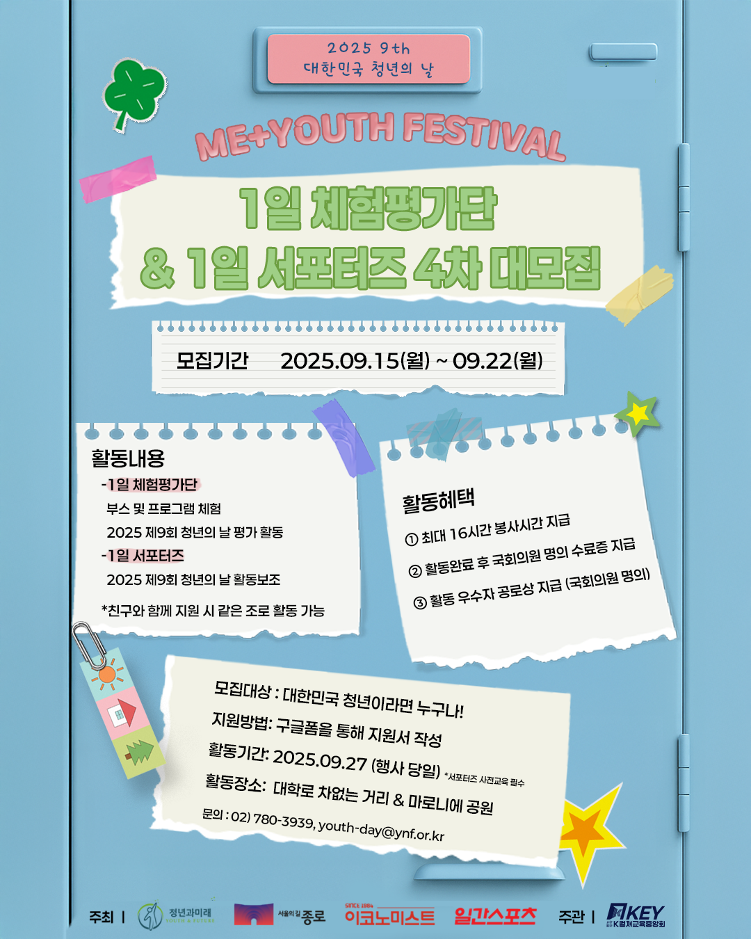 2025 제9회 대한민국 청년의 날 1일 체험평가단& 1일 서포터즈 4차 대모집!
