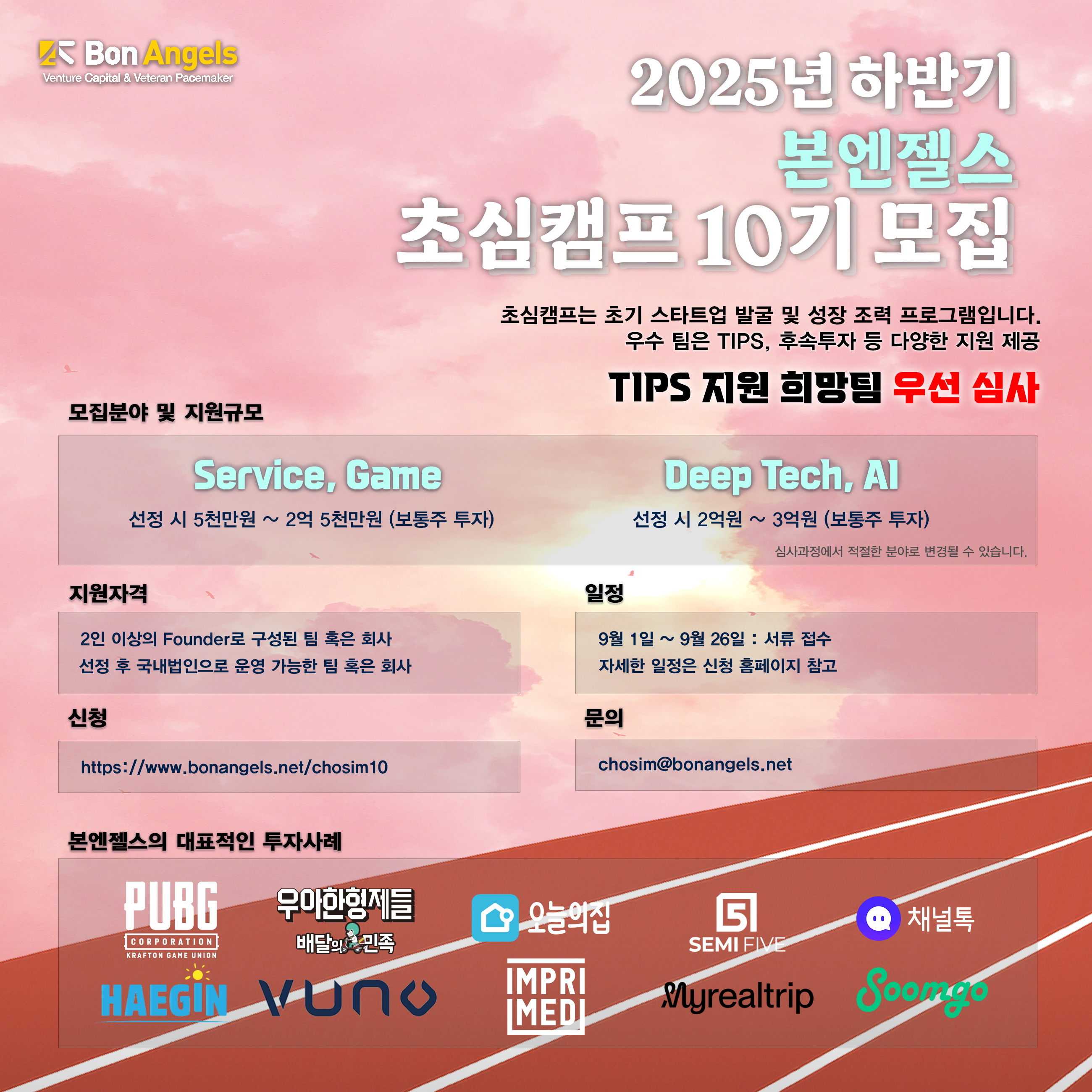본엔젤스는 초기 스타트업 전문 투자사로, 초기 스타트업의 페이스메이커 역할을 하는 배치 프로그램 '초심캠프'를 모집합니다.