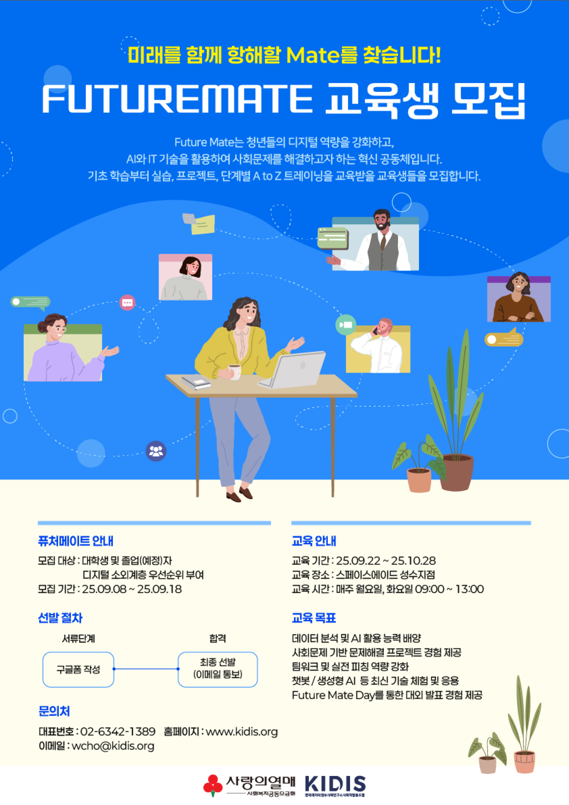 프로그램 수료 후에는 미래 산업 분야 취업 연계까지 지원으로 단순한 교육을 넘어, 기술 학습, 문제 해결, 멘토링으로 이어지는 완결형 과정 속에서 실질적인 성장과 진로 확장의 기회인 Future Mate 교육생들을 모집합니다.