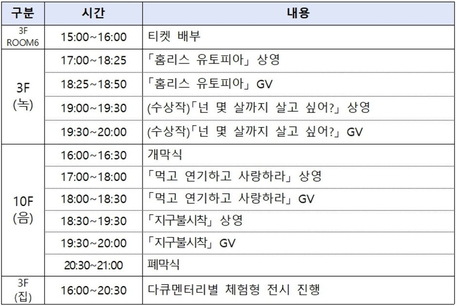 관객들이 각 다큐의 내용을 간접적으로 경험할 수 있도록 구성된다.