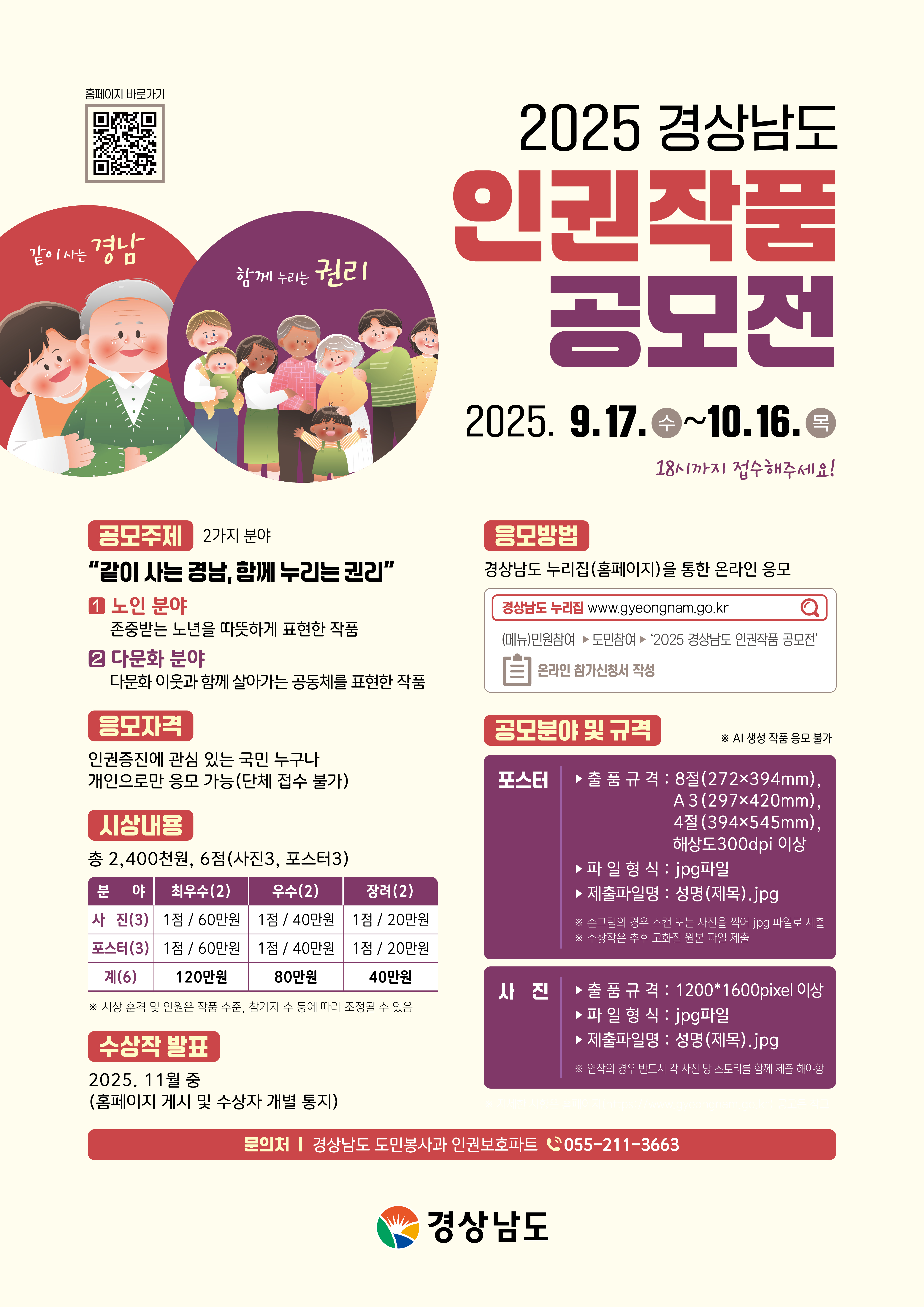 「2025 경상남도 인권작품 공모전」을 아래와 같이 실시하니 적극적인 참여를 바랍니다.