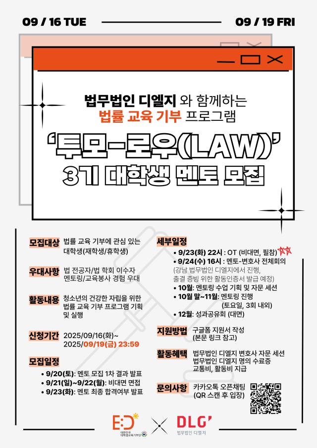 법무법인 디엘지와 함께하는 법률 교육 기부 프로그램 ‘투모-로우(law)’ 대학생 멘토 모집
