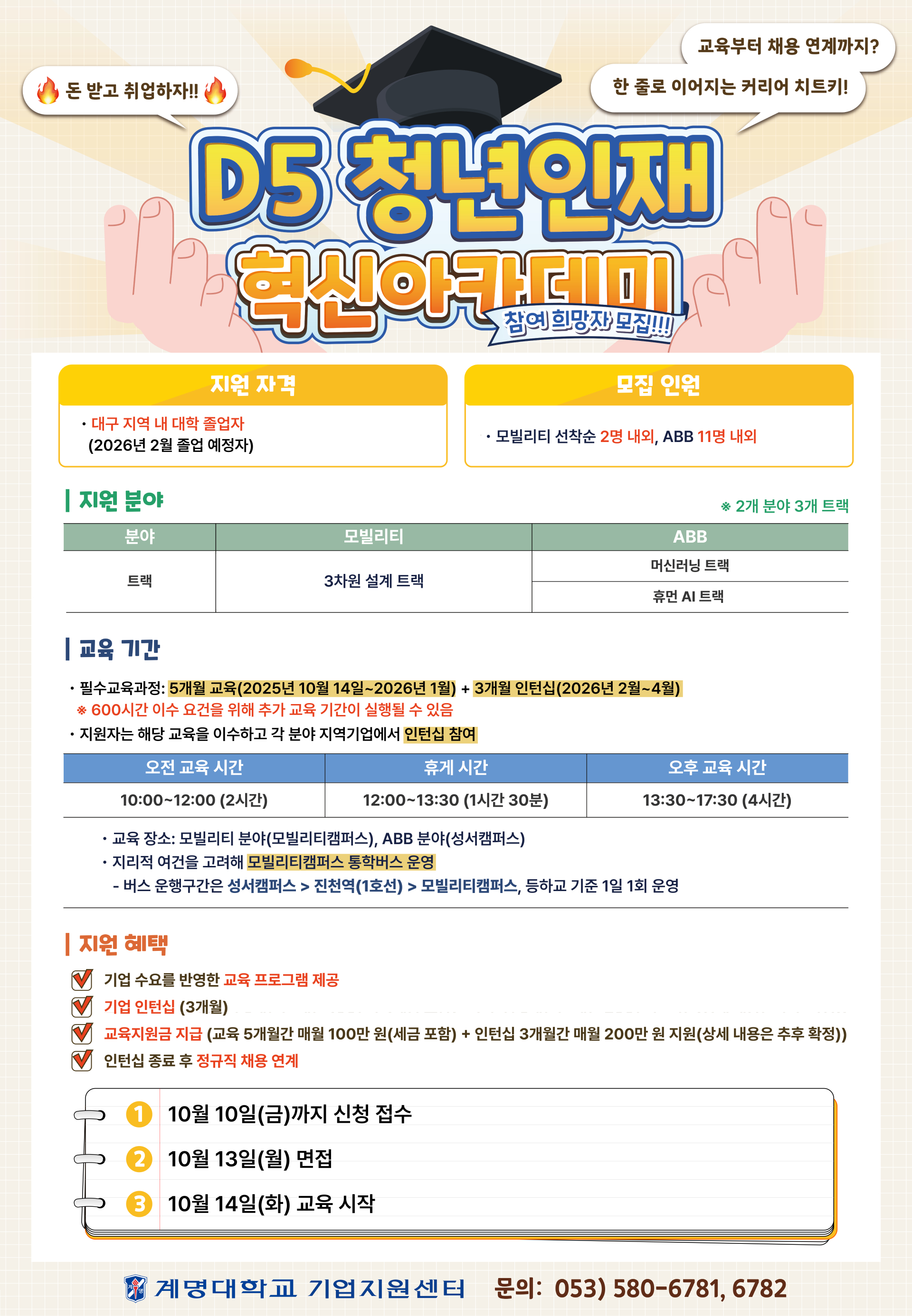 -계명대학교는 지역내 청년들의 취업 역량을 강화하고, 미래 산업 분야의 인재를 양성하기 위해 ‘D5 청년인재 혁신아카데미’를 운영합니다.