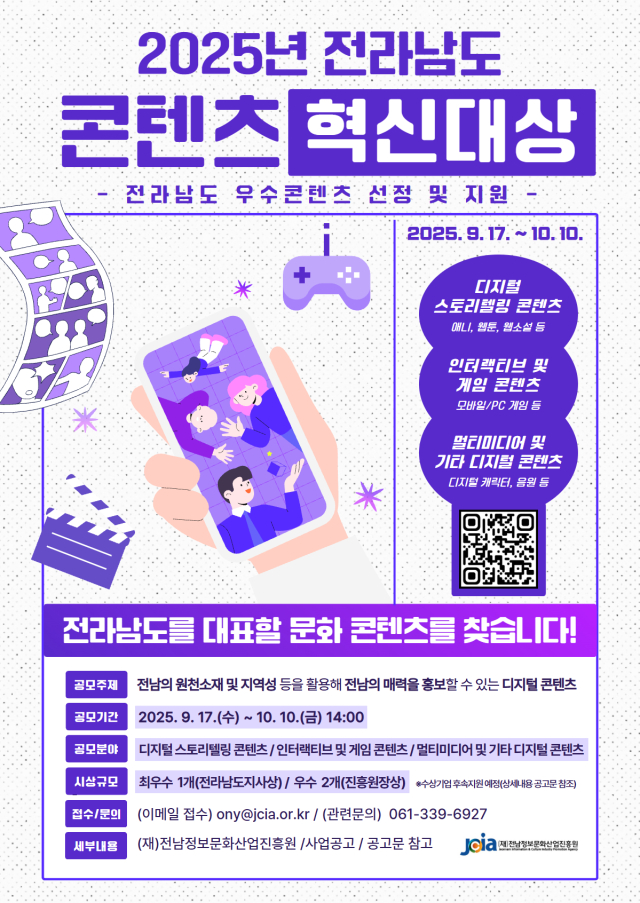 지역 대표 콘텐츠 집중 육성을 위해 「2025년 전라남도 콘텐츠 혁신대상」을 공모하오니