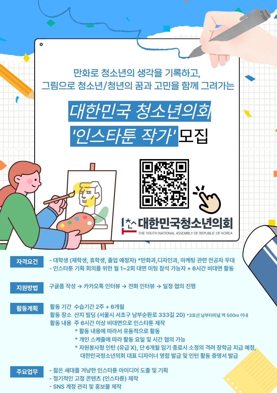 <[대한민국청소년의회] 정기적인 청소년 SNS 고정 인스타툰 제작 담당 대학생 작가 모집>