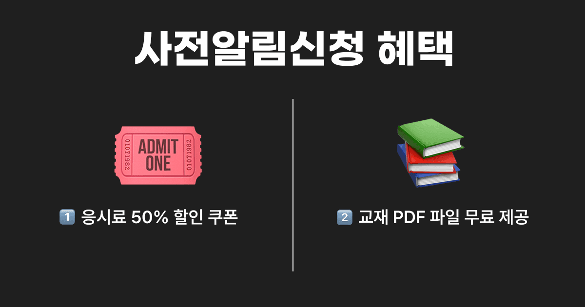 10/25(토) 오전에 문자로 시험 접수 알림 + 할인 쿠폰 + 교재 PDF가 함께 발송됩니다.