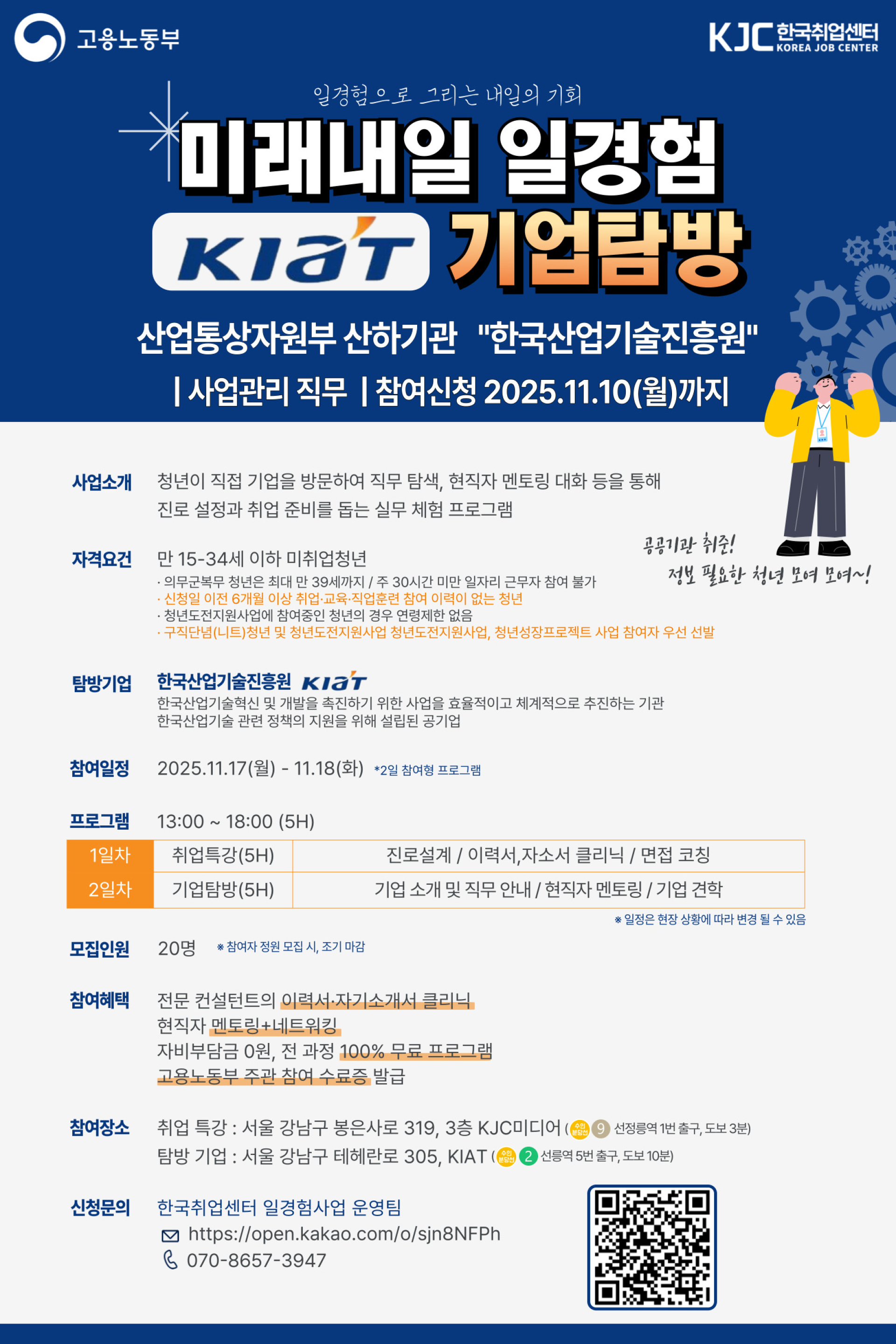 [고용노동부] 미래내일 일경험 공공기관 한국산업기술진흥원 (KIAT) 기업탐방, 산업관리 직무 참여 청년 모집