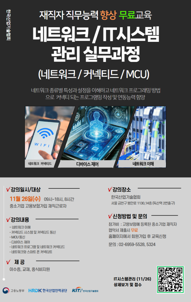 [한국산업기술협] 네트워크 / IT시스템관리 실무과정 재직자 무료교육(11.26,수)