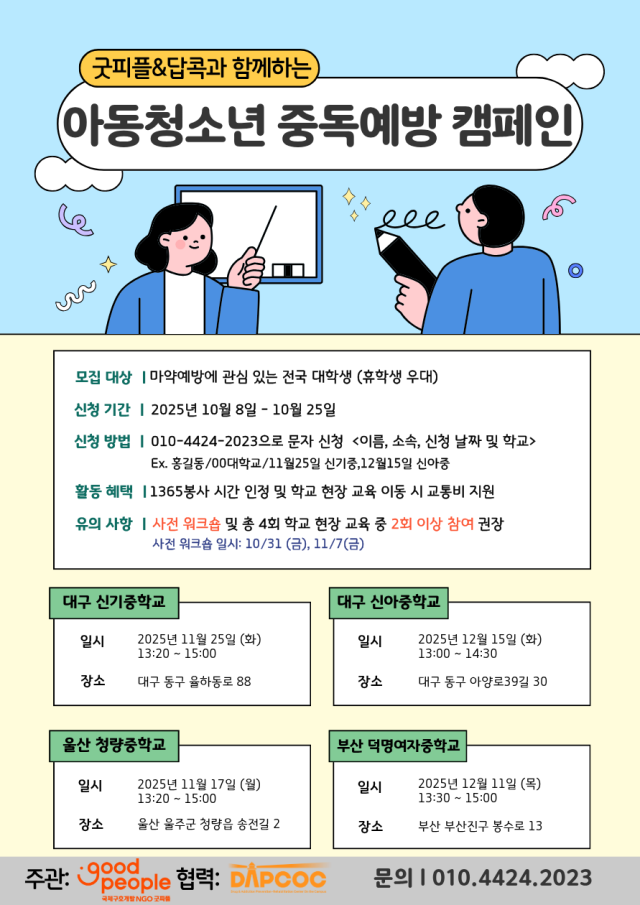 - 굿피플과 답콕이 함께 중독예방교육이 잘 전달되지 못하는 지역 청소년들을 위한