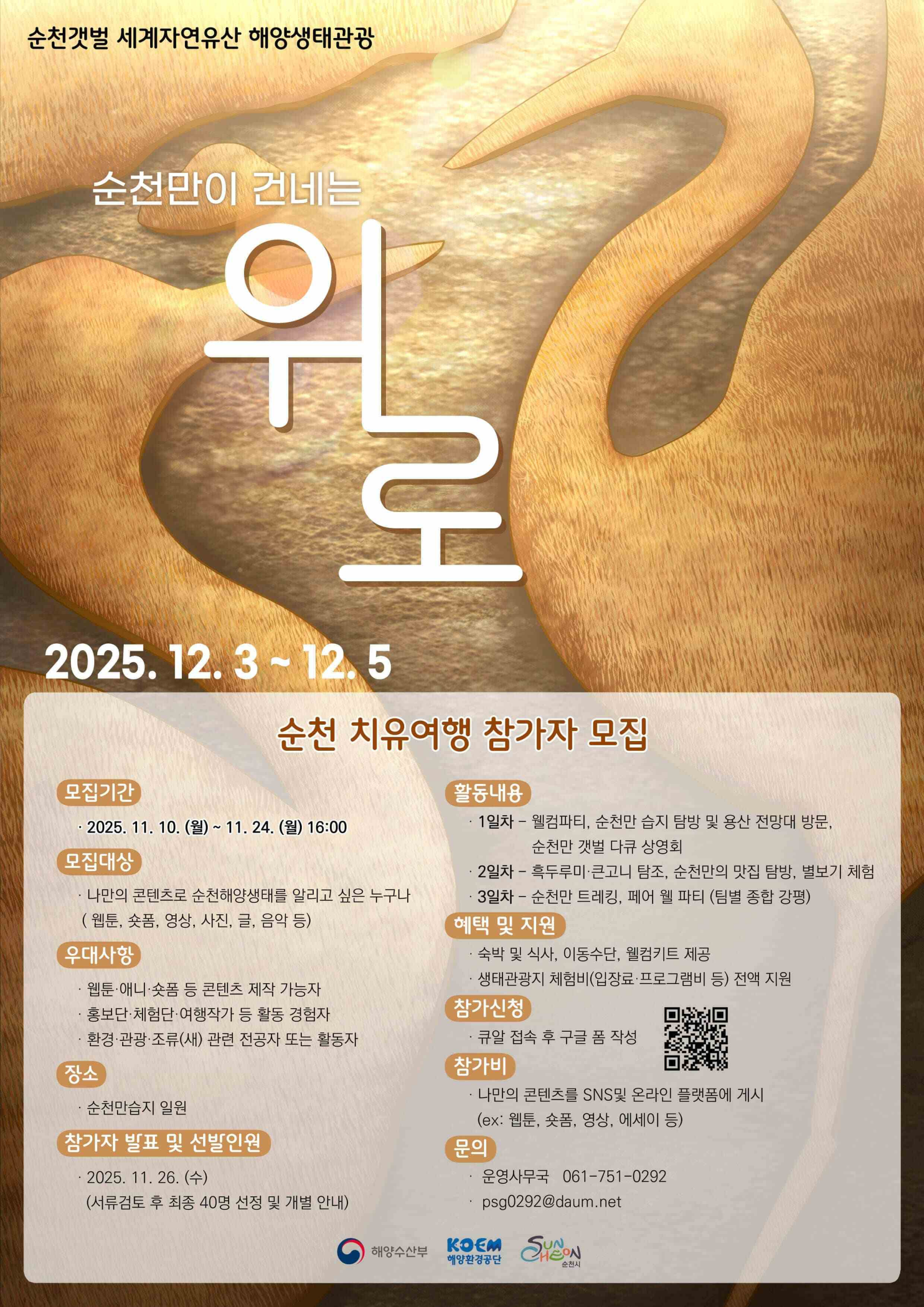 - 나만의 콘텐츠로 순천해양생태를 알리고 싶은 누구나 (웹툰, 숏폼, 영상, 사진, 글, 음악 등)