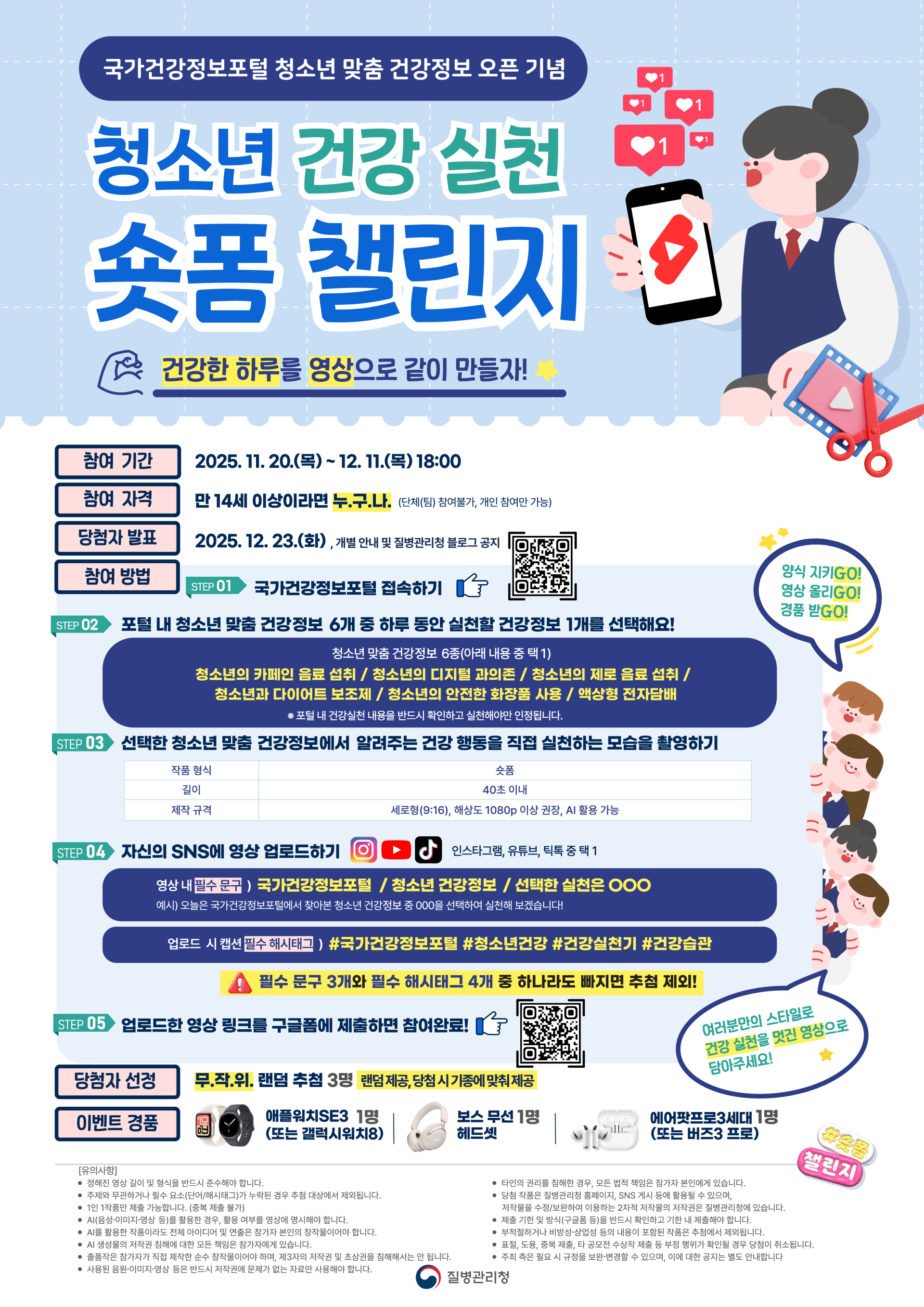 - 당첨자 발표: 2025.12.23.(화), 개별 안내 및 질병관리청 블로그 공지
