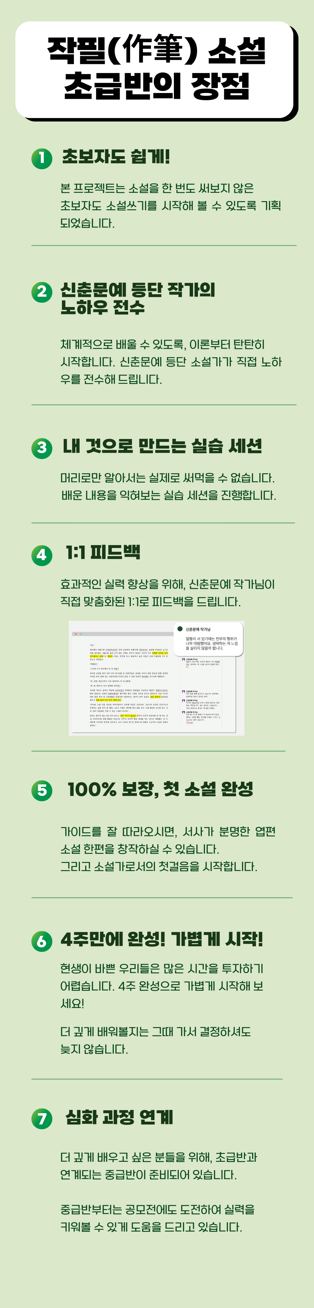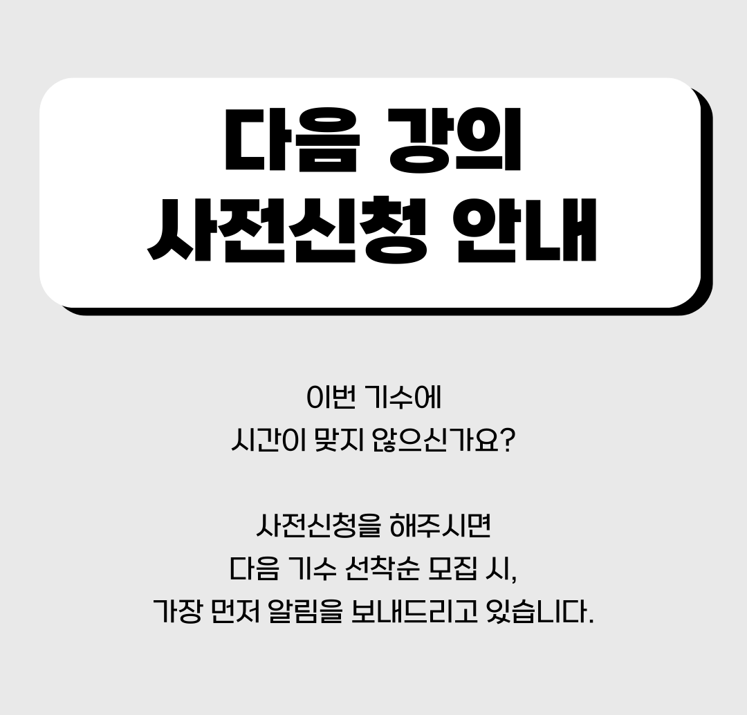 또한 실습 세션과 신춘문예 작가님의 1:1 피드백을 통해 소설가로서의 첫 작품을 내어볼 수 있도록 준비했습니다.