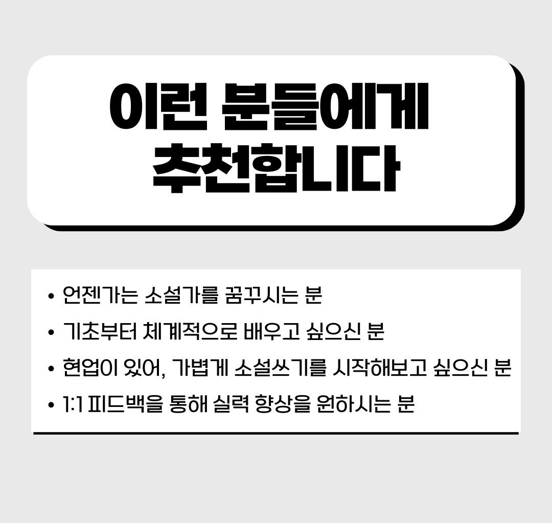 제대로 소설 쓰기를 배우고, 소설가의 첫 스텝을 밟고자 하시는 분들께 이 프로그램을 추천드립니다.
