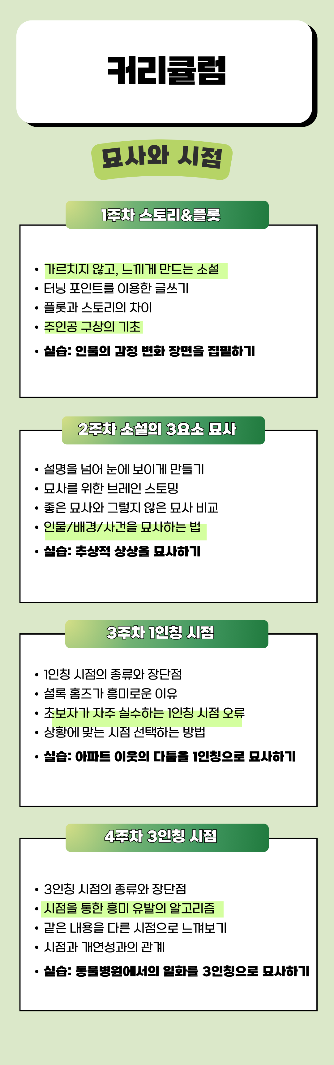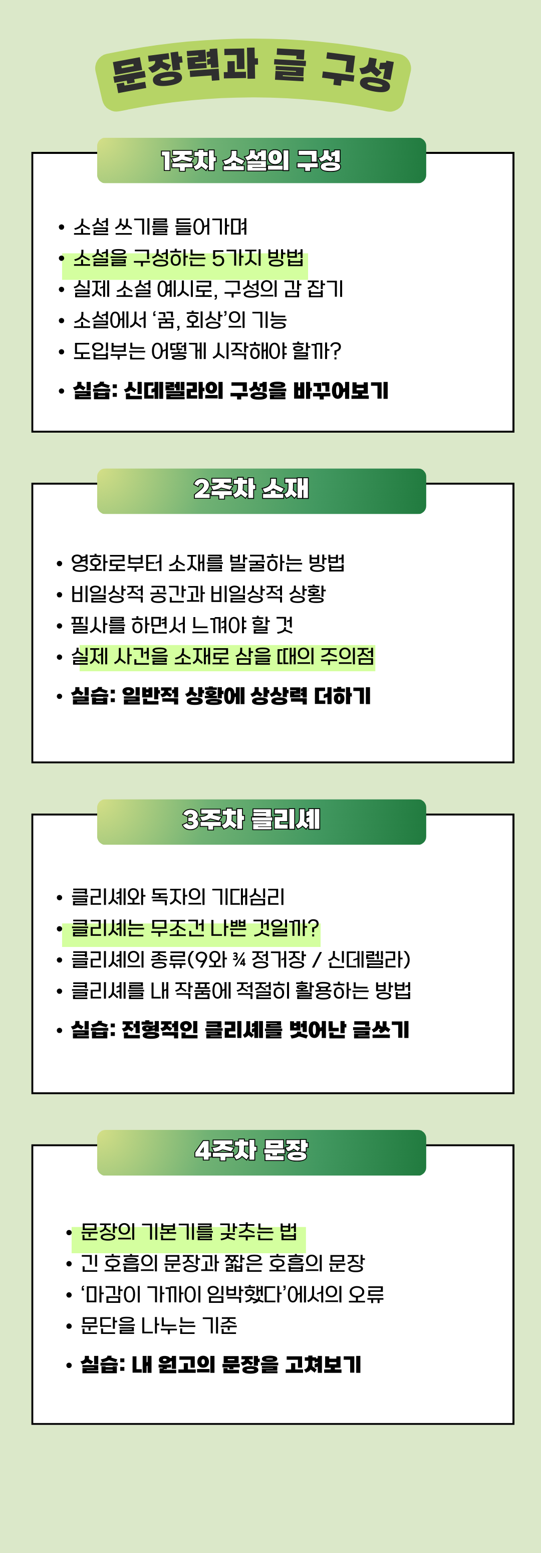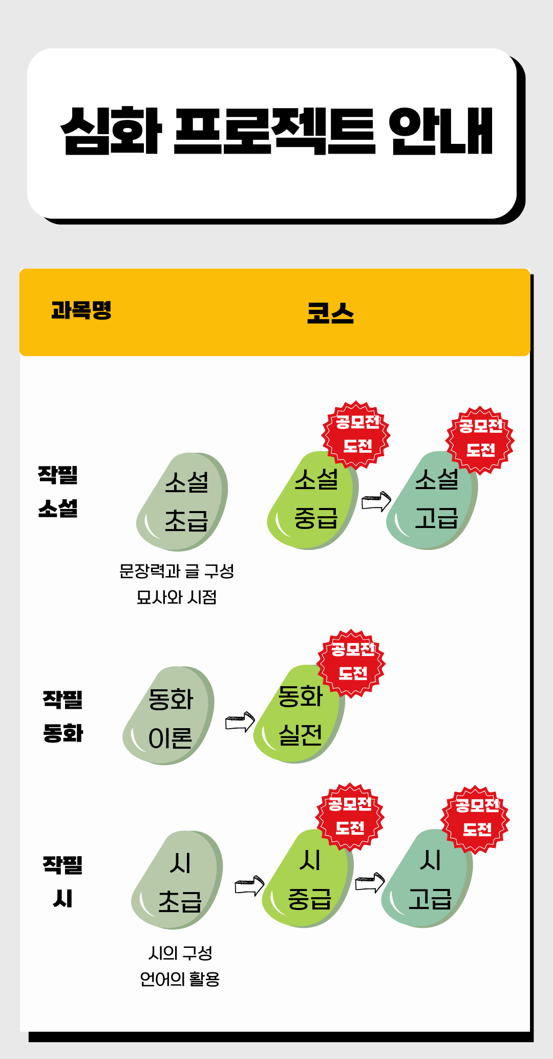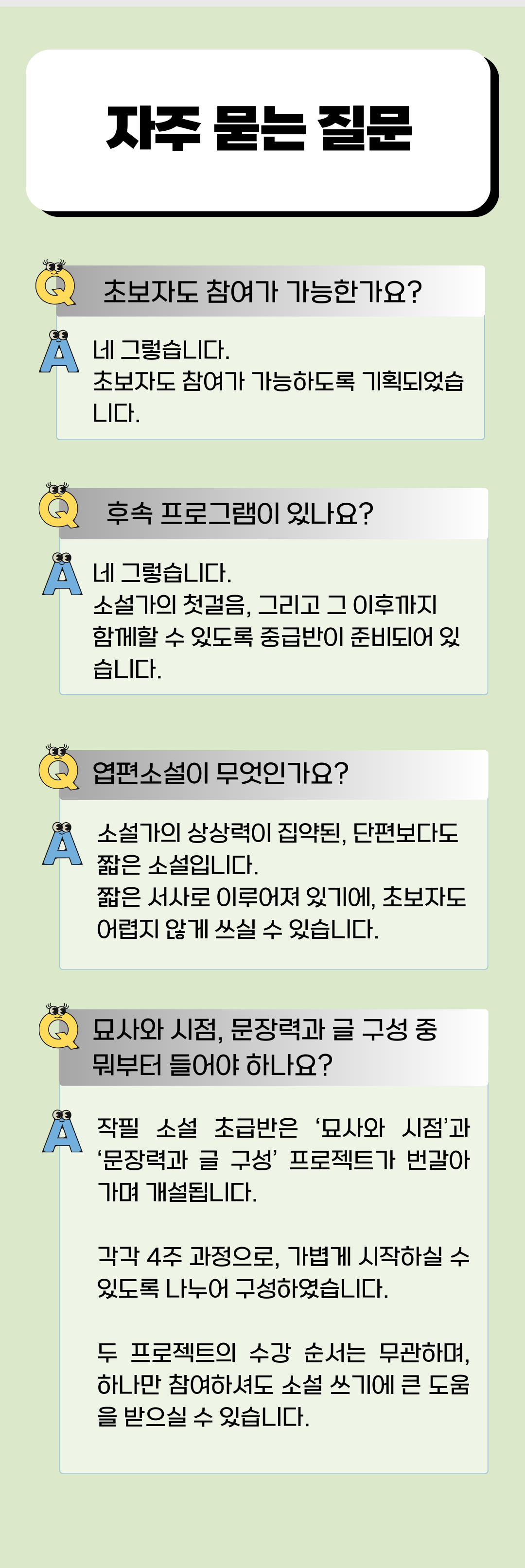작필 소설 초급반은 ‘묘사와 시점’과 ‘문장력과 글 구성’ 프로젝트가 번갈아 가며 개설됩니다. 각각 4주 과정으로, 가볍게 시작하실 수 있도록 나누어 구성하였습니다.