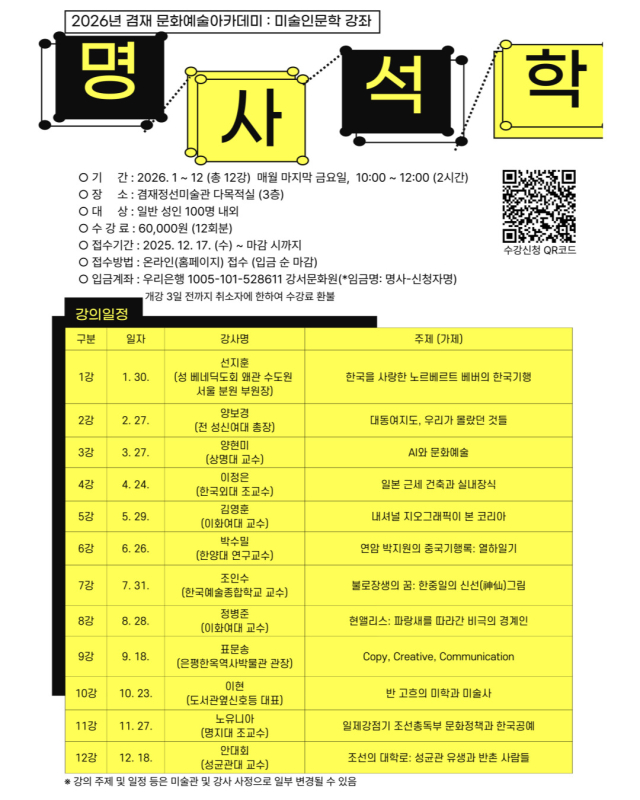 2026년 겸재 문화예술아카데미 <명사석학 미술인문학 강좌> 모집