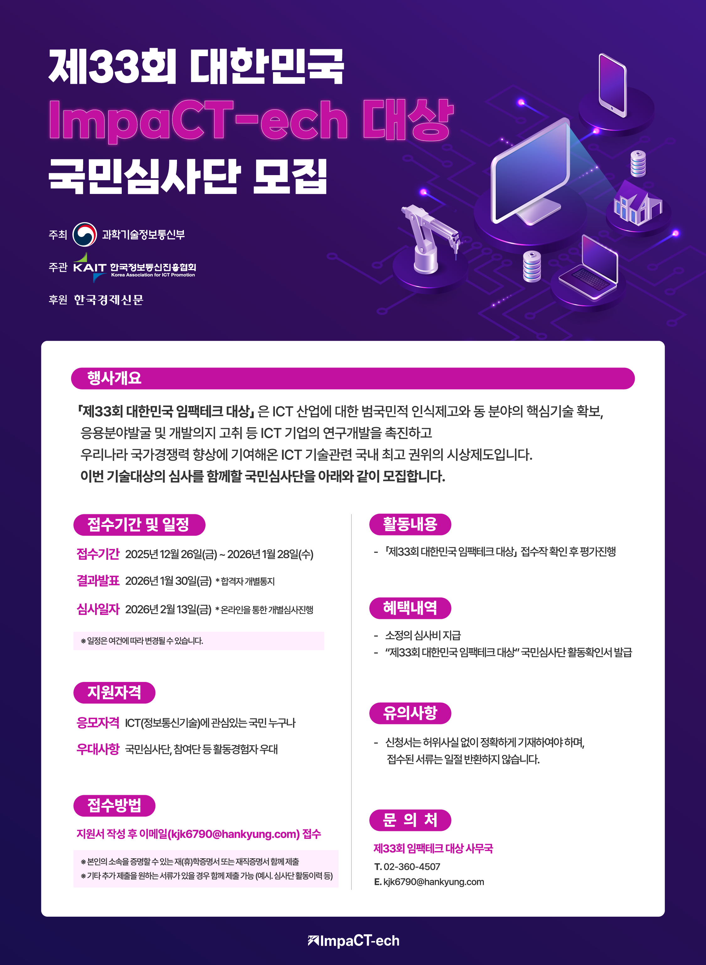 - “제33회 대한민국 임팩테크 대상”은 ICT 산업에 대한 범국민적 인식제고와