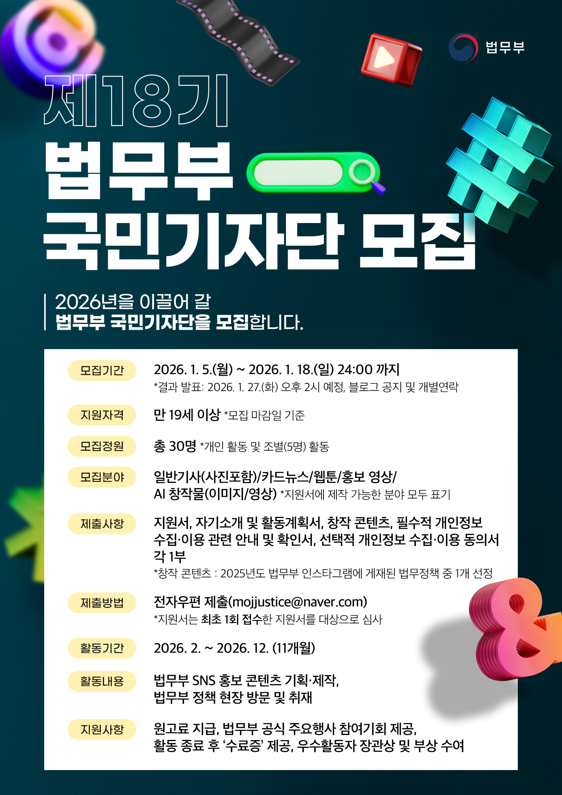 - 2026년을 이끌어갈 '제18기 법무부 국민기자단' 주인공을 찾습니다.