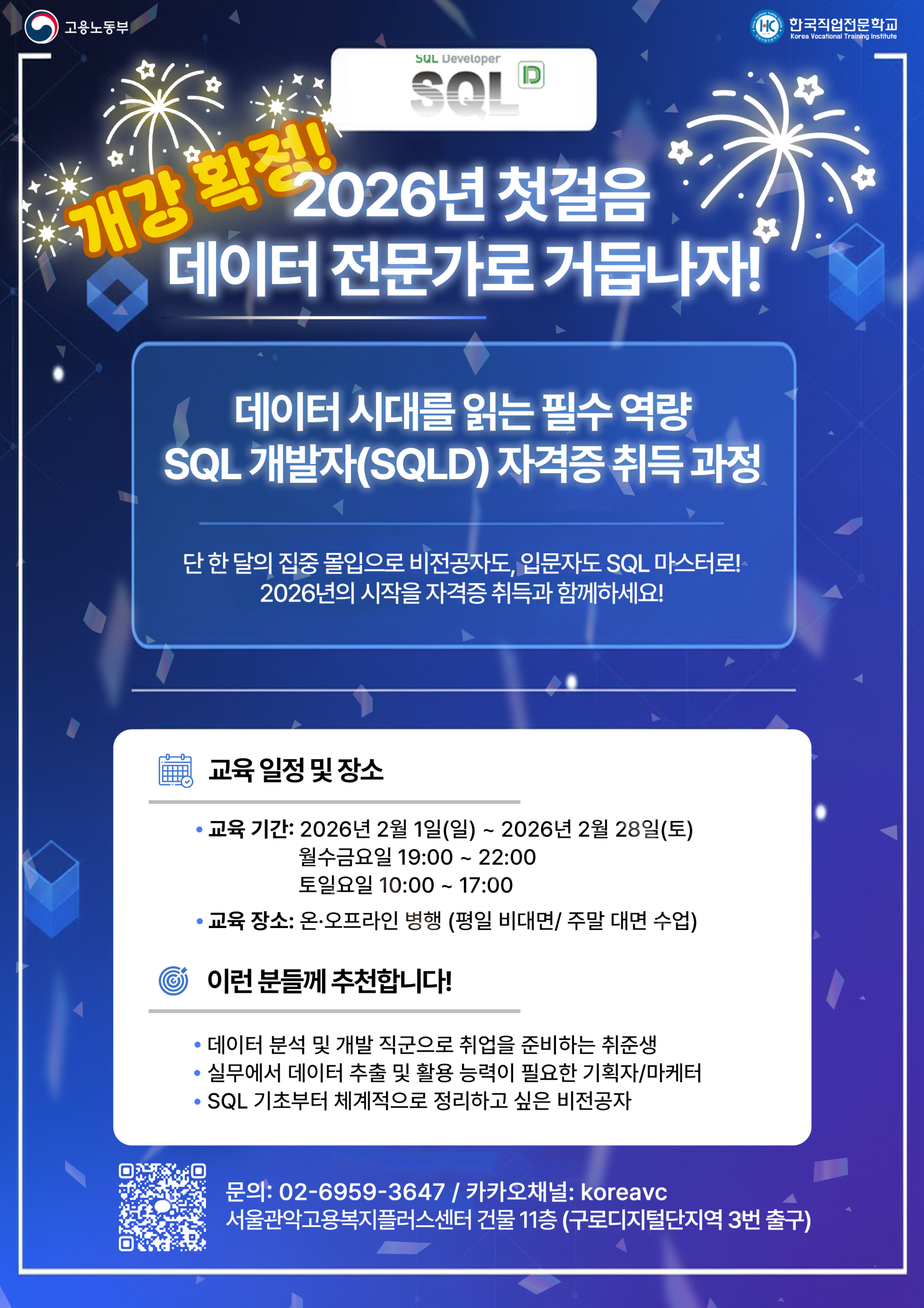 - SQL을 작성할 수 있는 국가공인 SQL 개발자(SQLD) 자격증을 취득할 수 있습니다.