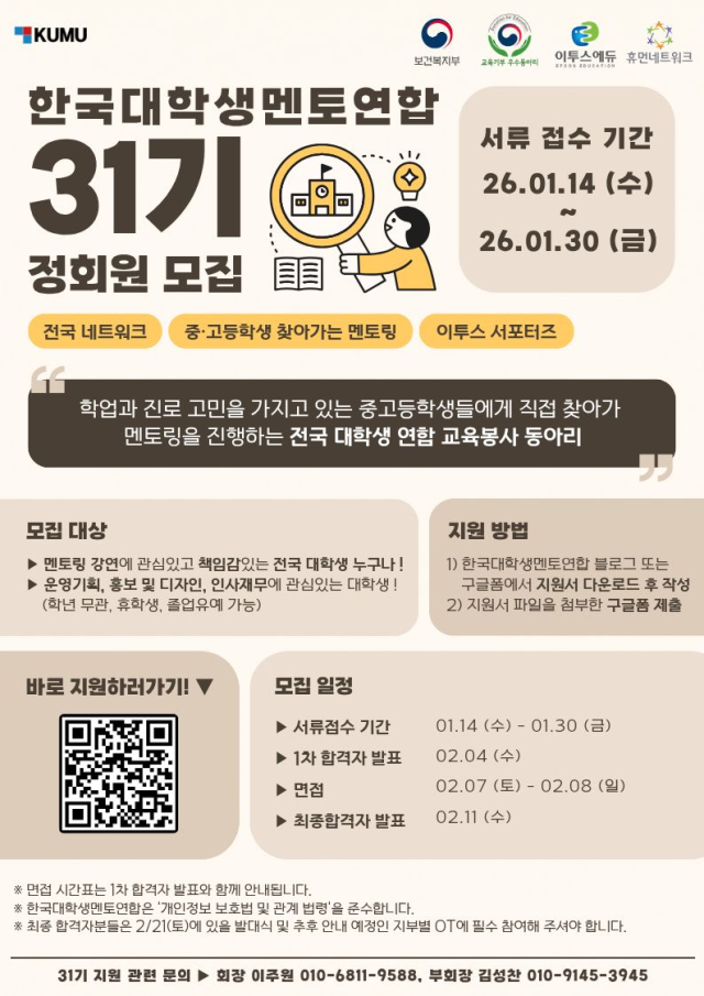 한국대학생멘토연합(KUMU) 31기 신입 기수 모집 (~1/30)