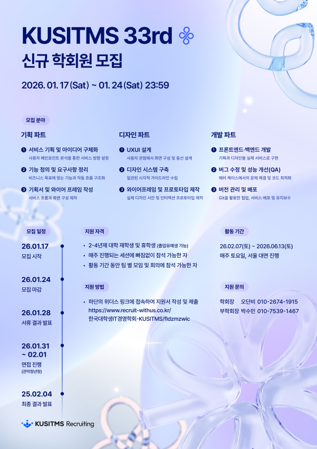 한국대학생IT경영학회 큐시즘(KUSITMS) 33기 신규 학회원 모집(~1/24)