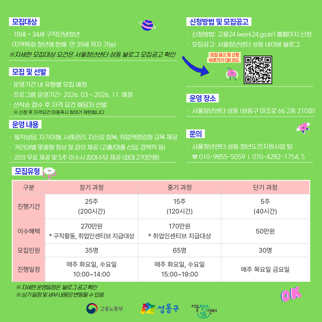 아래 링크 클릭하여 "고용 24" 페이지 이동 → 취업지원-취업역량강화 → 청년도전지원사업 (서울청년센터 성동) 신청