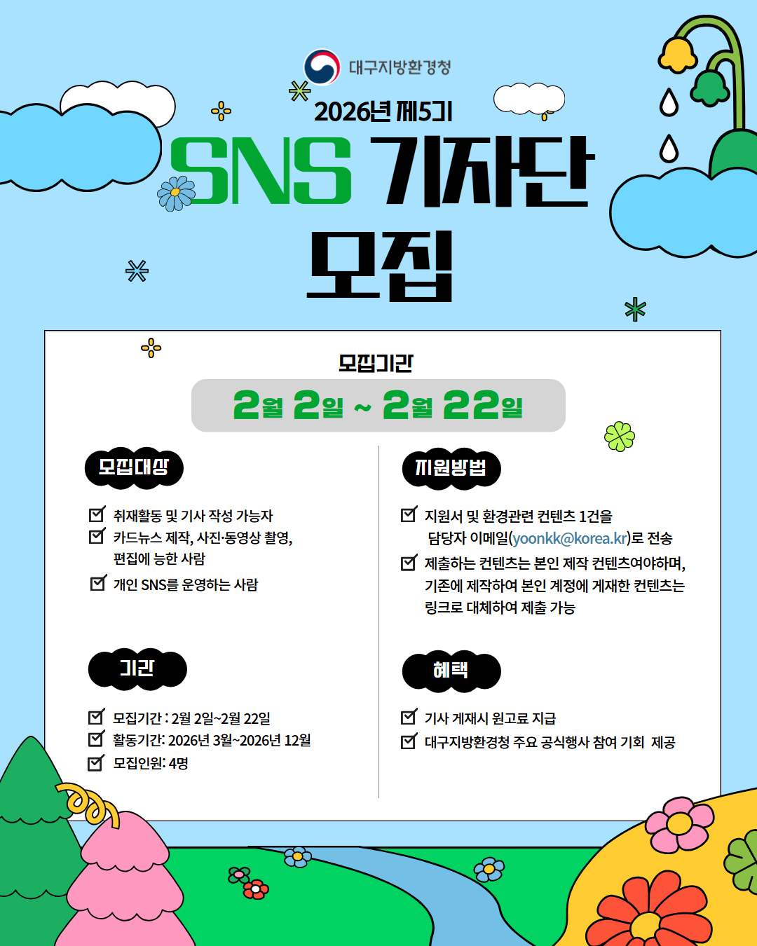 | 혜택 | 기사 게재시 원고료 지급, 대구지방환경청 주요 공식행사 참여 기회 제공 |