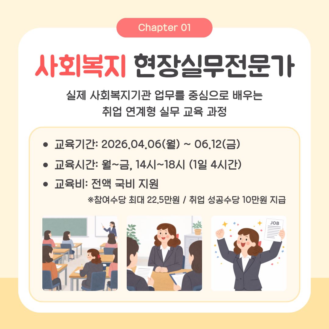 사회복지사 자격증 취득 후, 경력이 없거나 경력이 단절되어 사회복지 분야로 취업이 어려운 여성분들을 대상으로 사회복지 행정 및 현장 실무 경험을 쌓고 전문성을 강화시켜 취업을 지원하고자 하오니 관련 분야로의 취업을 희망하는 분들의 많은 참여 바랍니다.