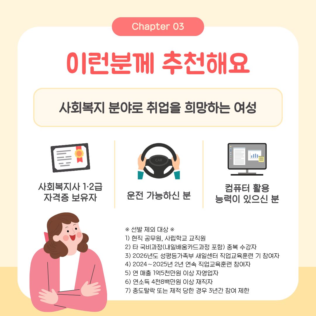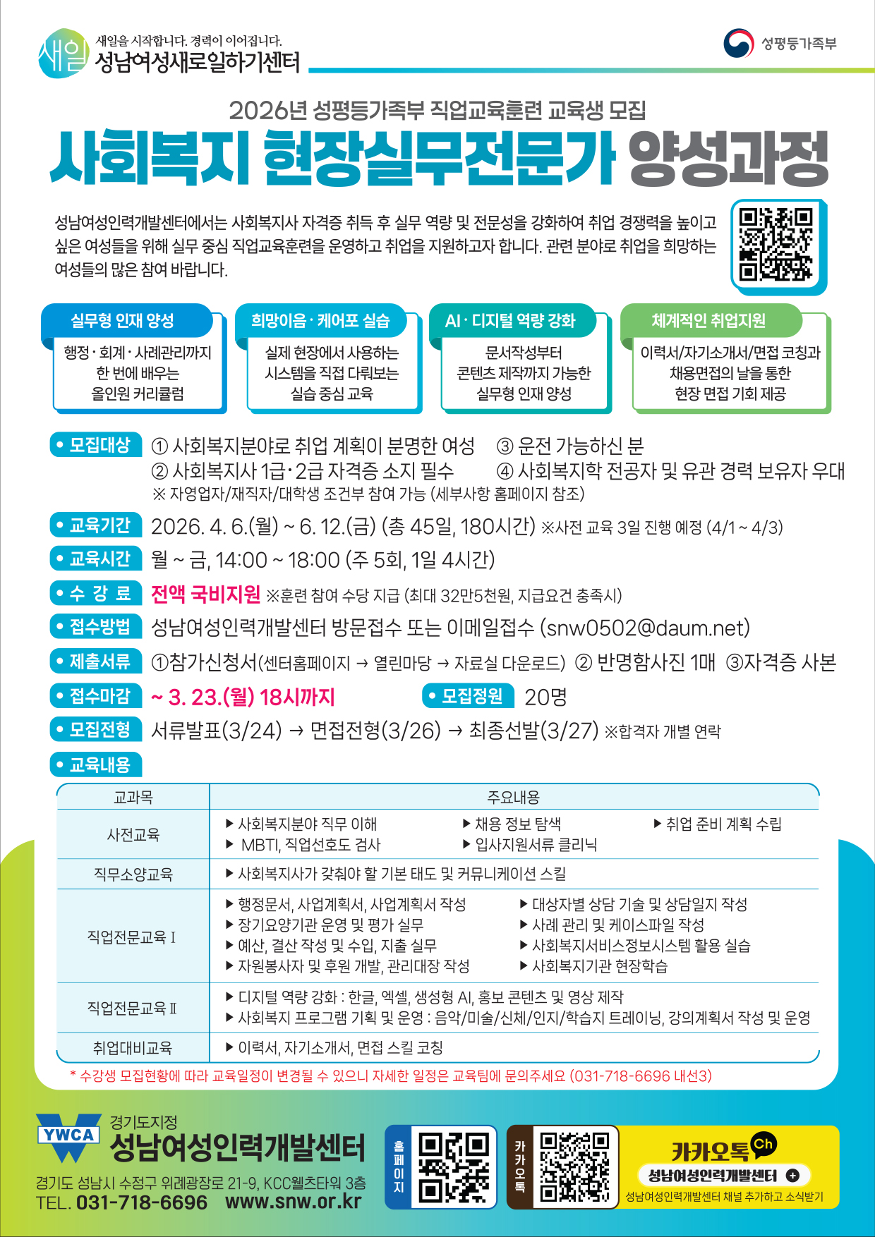 - 사회복지분야로 취업을 희망하는 성남시 인근 지역 거주 여성