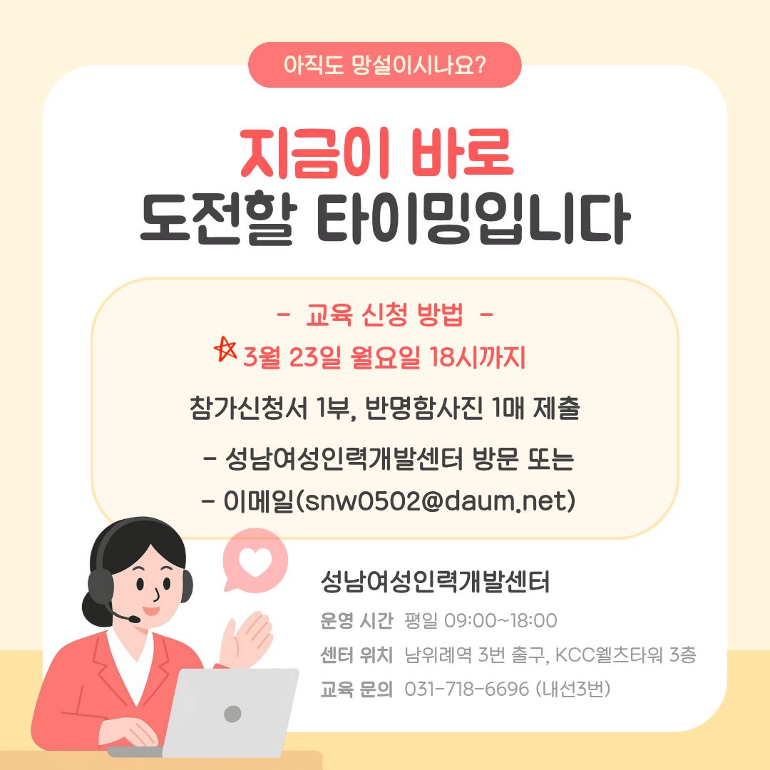 - ☏ 성남여성인력개발센터 교육팀 031-718-6696(내선3)