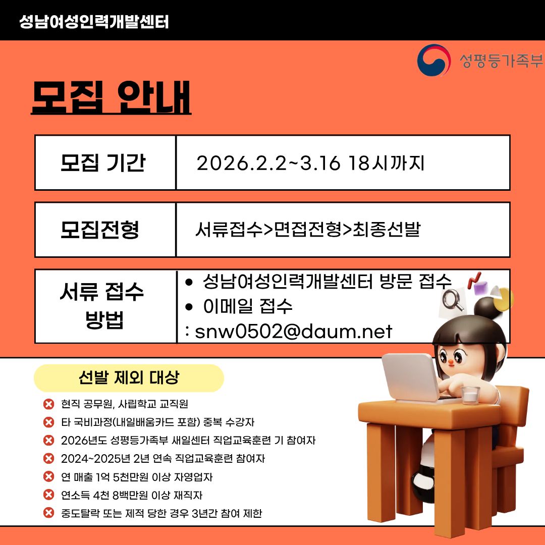 - 성남시 및 인근 지역에 거주하는 청년 여성, 경력보유 여성으로 교육 수료 후 취업 의지가 확고한 자