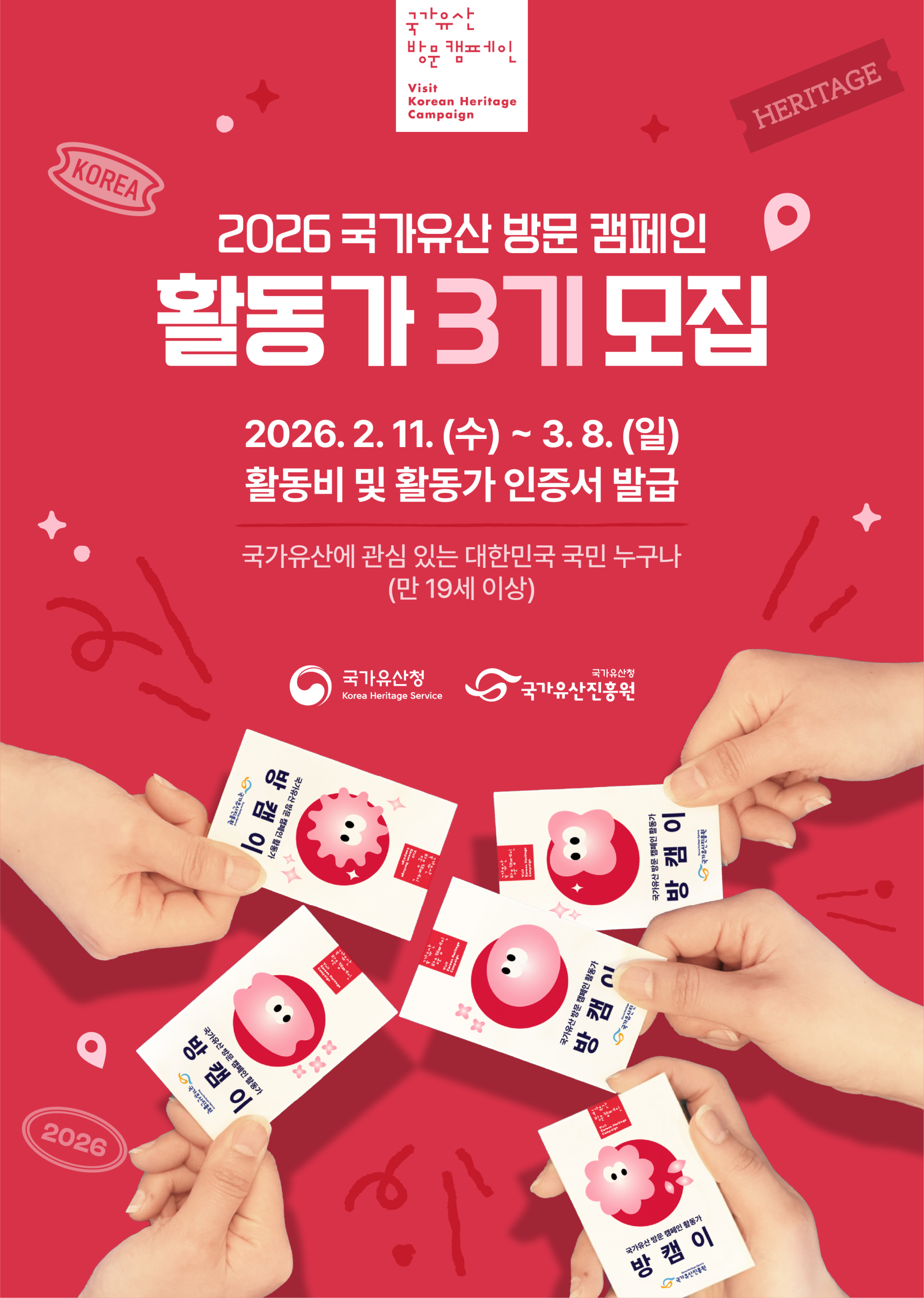 | 혜택 | 활동비 지급, 활동 완료 시 국가유산 방문 캠페인 활동가 인증서 발급 外 |
