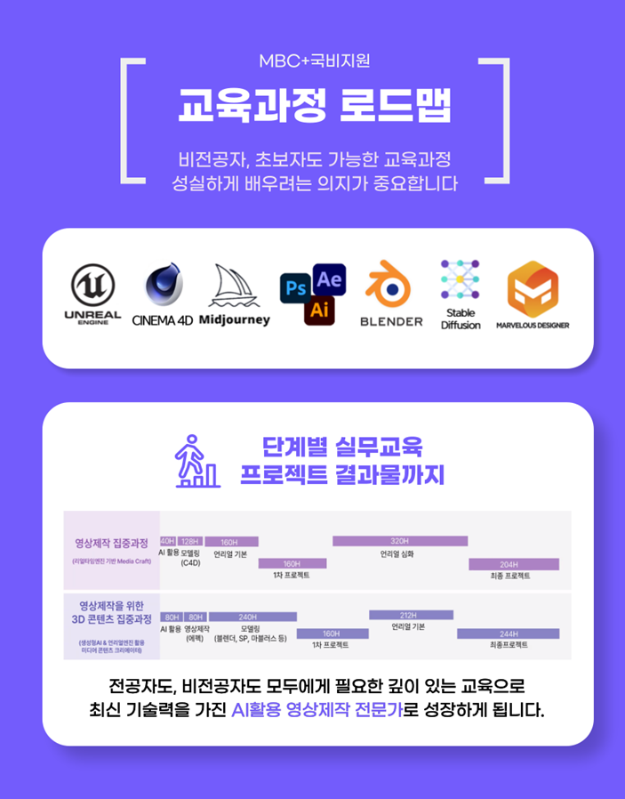 • [사용프로그램] -> 언리얼 엔진5, 시네마4D, 블랜더, 포토샵/일러스트, 애프터 이펙트, 미드저니 등등 교육과정에 따라 영상사용툴 다름.