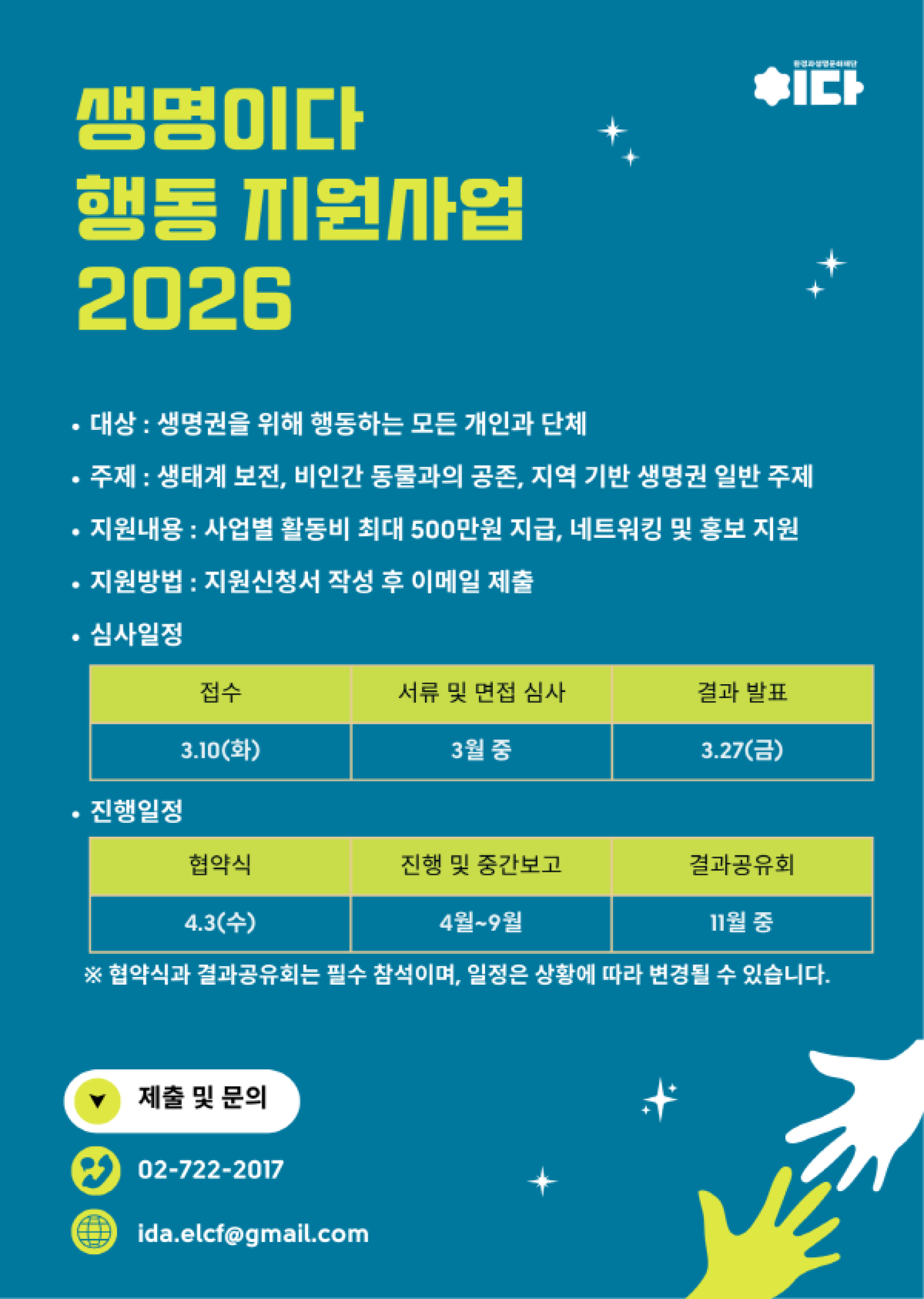 - ☏ 02-722-2017 (환경과생명문화재단 이다 사무국)