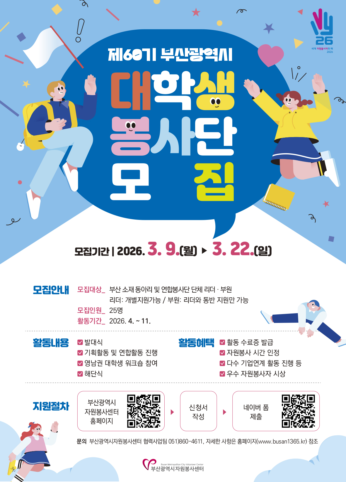 제60기 부산광역시대학생봉사단 모집 연장 공고
