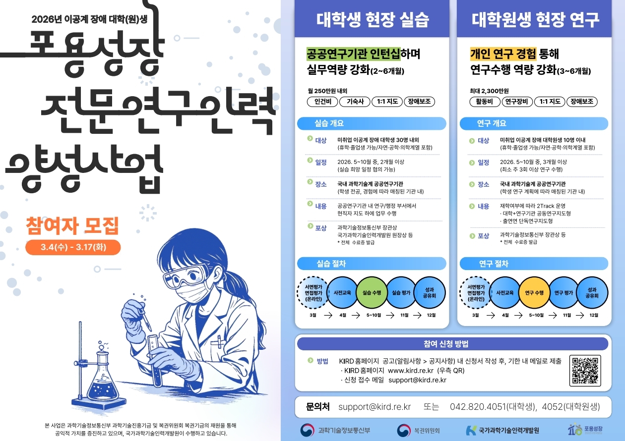 - KIRD에서 2026년 포용성장 전문연구인력양성사업 참여자를 모집하오니 많은 관심 바랍니다.