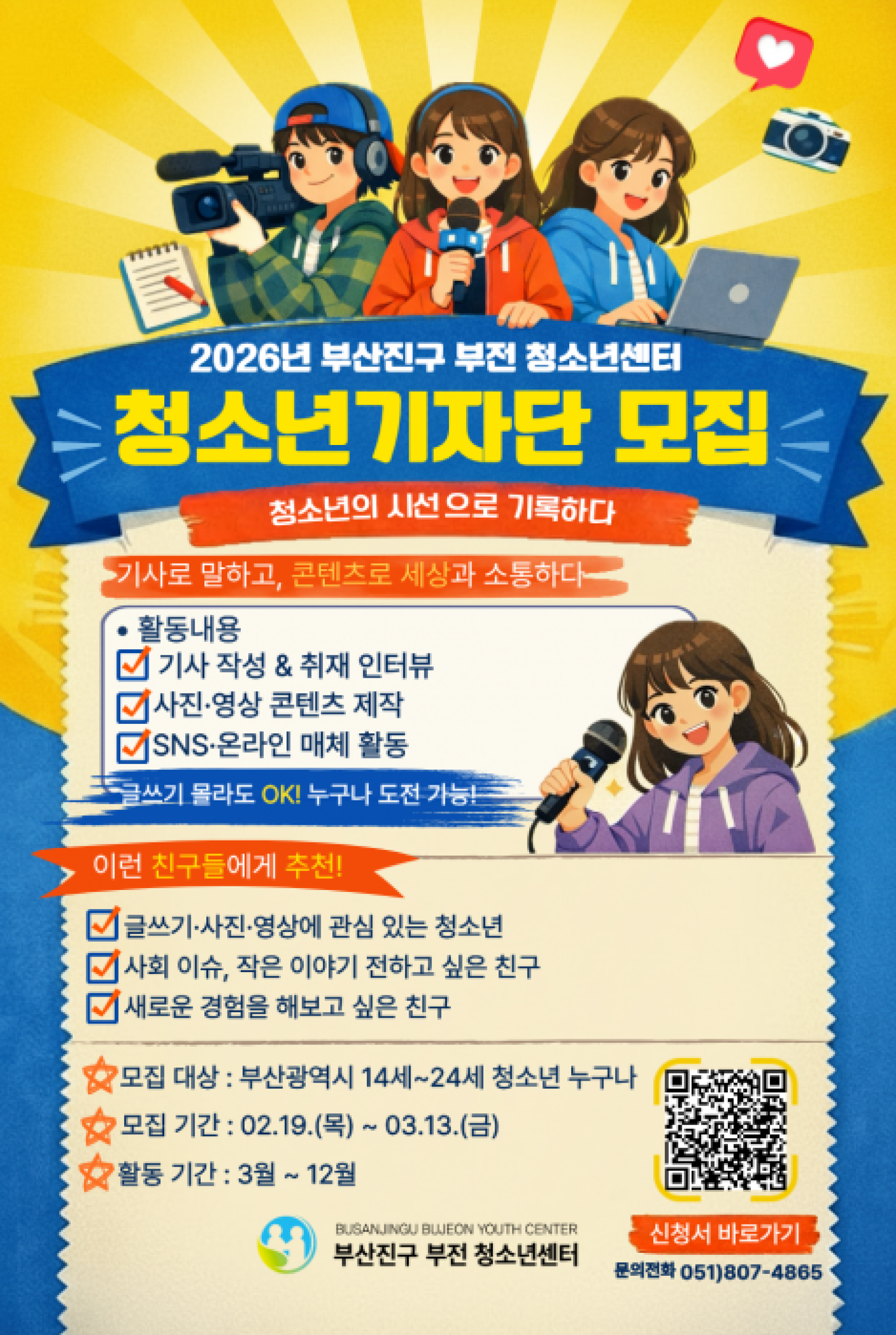 - 부산진구 부전 청소년센터에서 2026년 청소년기자단을 모집합니다.