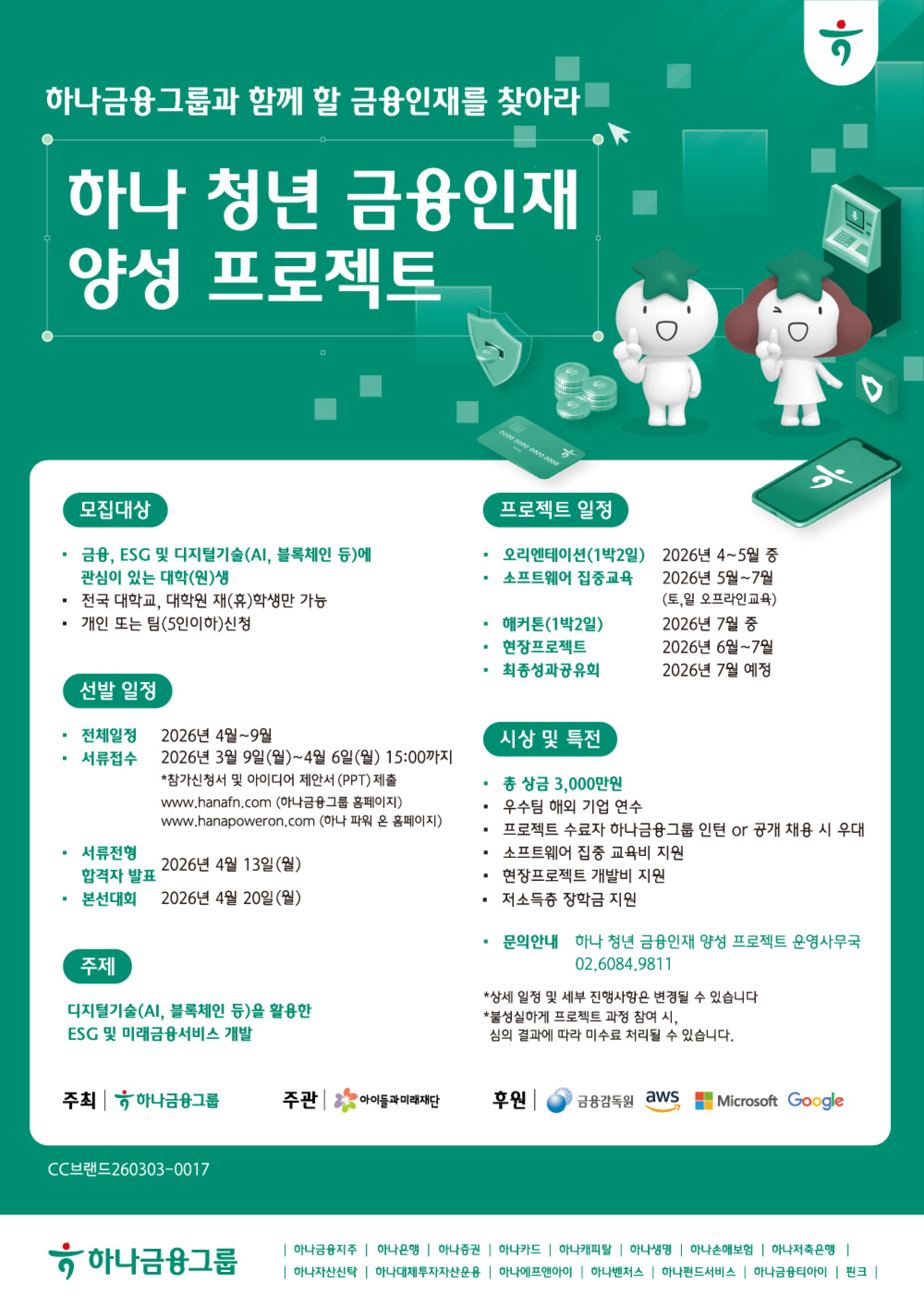 - ☏ 하나 청년 금융인재 양성 프로젝트 운영사무국 02-6084-9811
