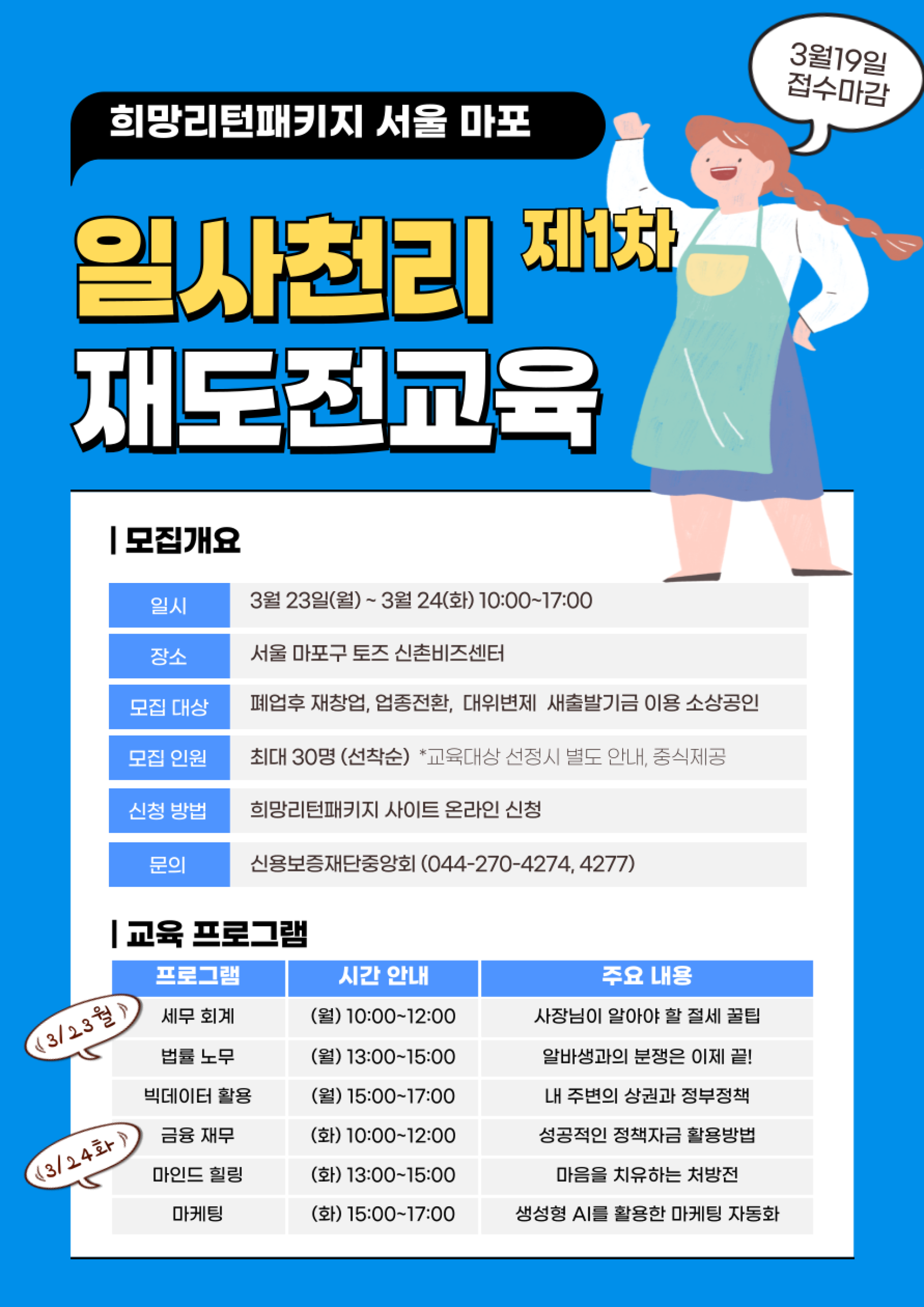 - 폐업, 업종전환을 고민하거나, 사업의 어려움을 겪은 후 다시 일어서고자 하는 소상공인에게 꼭 알아야할 사업의 기본과목을 알려드리고 역량을 키워드리는 기초교육과정입니다.