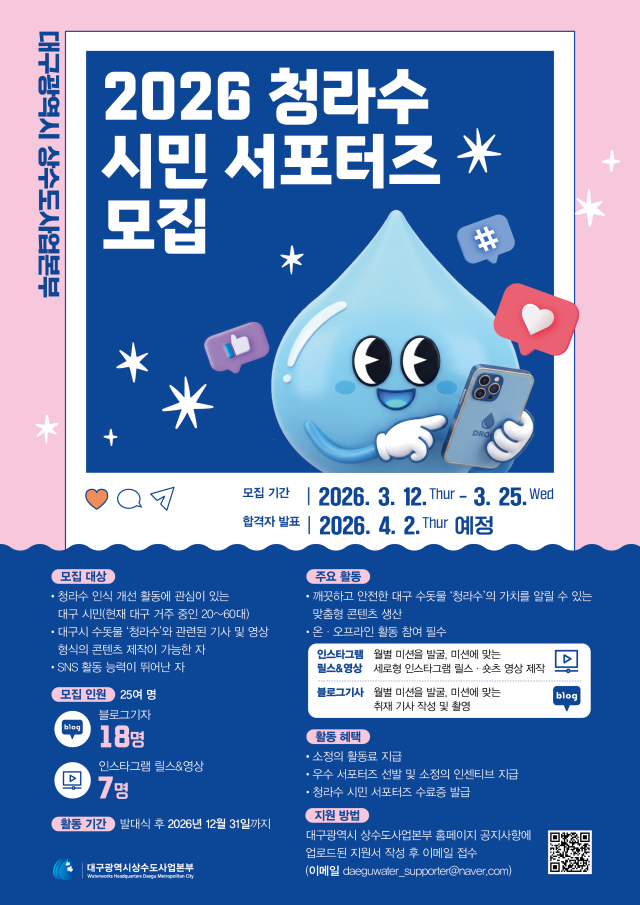 대구광역시 상수도사업본부 2026 청라수 시민 서포터즈 모집