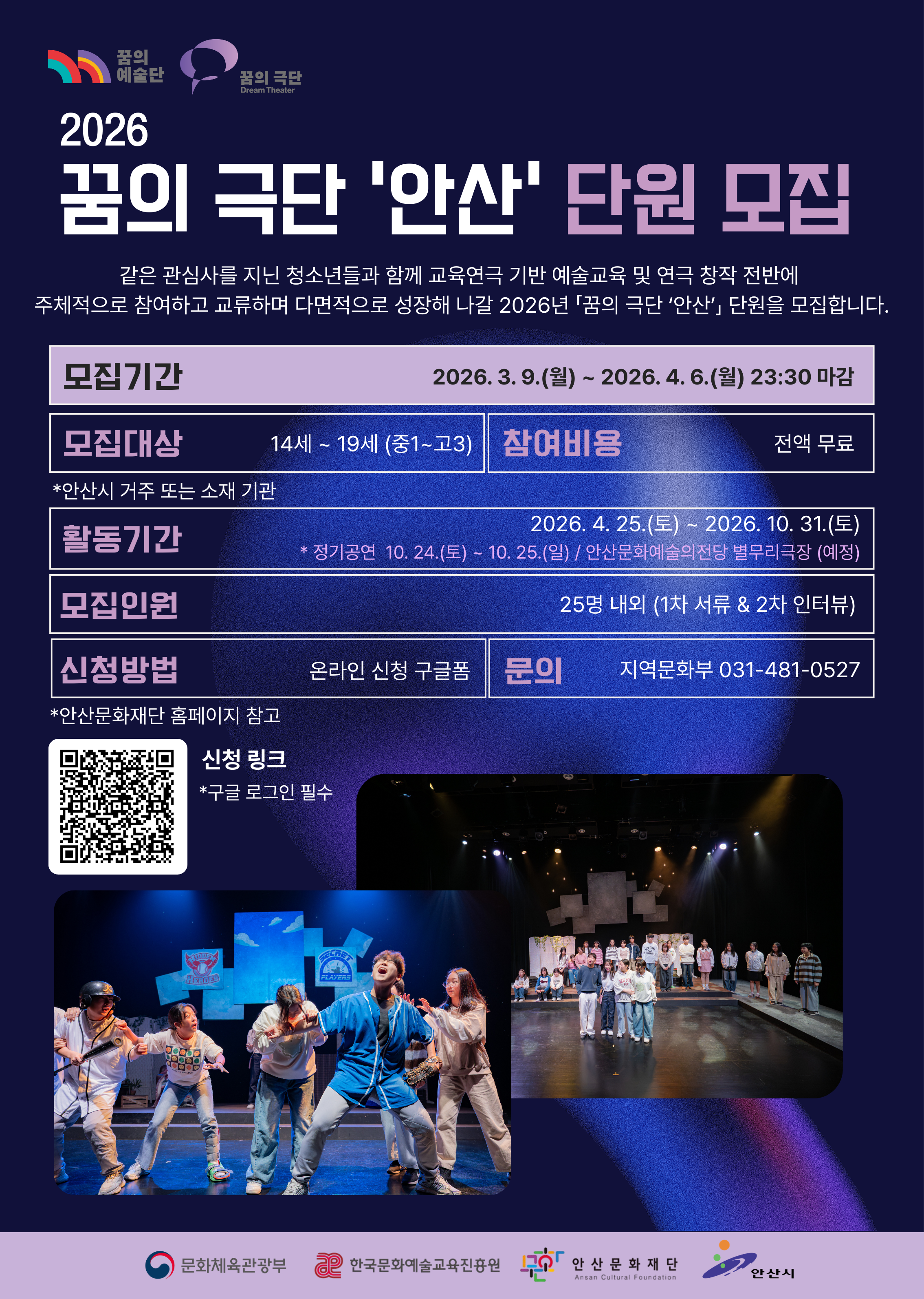 - 2026 꿈의 극단 '안산' 단원이 되어 연극 무상 교육에 참여할 청소년을 모집합니다!