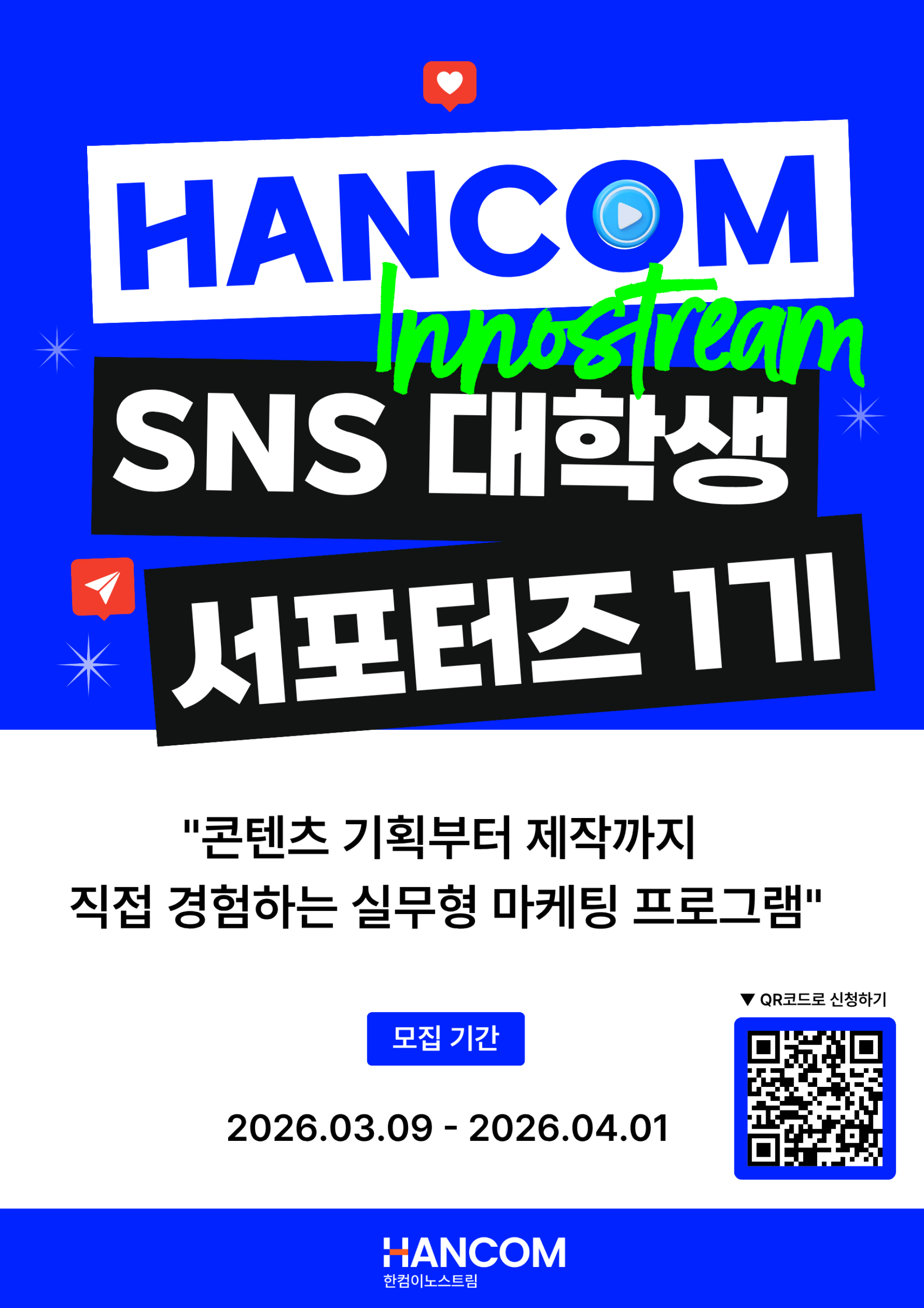 - 2026 한컴이노스트림 SNS 대학생 서포터즈 1기를 모집합니다.