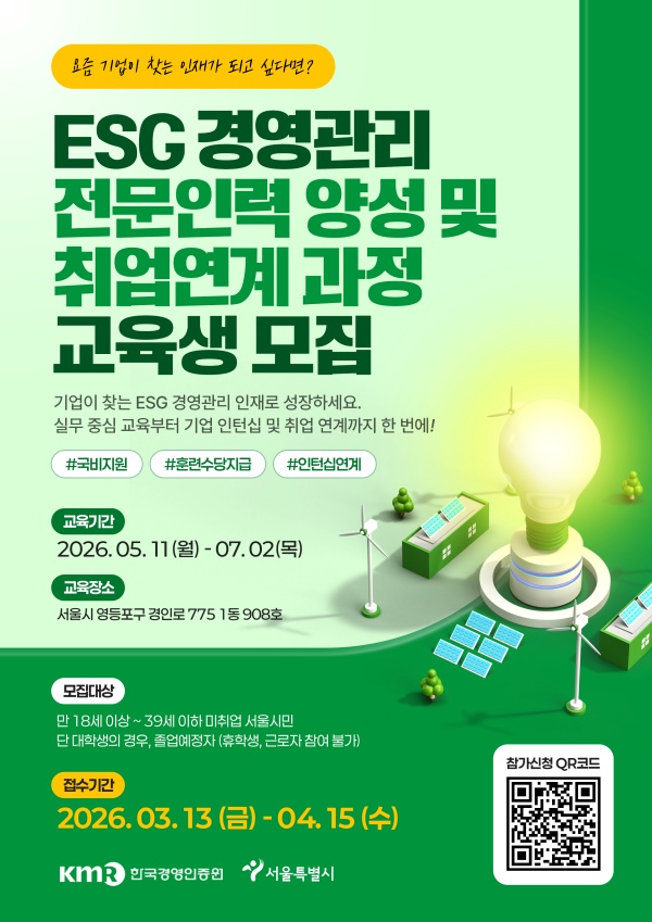[한국경영인증원] 서울시 지원 ESG 경영관리 전문인력 양성 및 취업연계 과정 (~4/15)