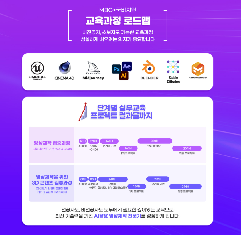 • [사용프로그램] -> 언리얼 엔진5, 시네마4D, 블랜더, 포토샵/일러스트, 애프터 이펙트, 미드저니 등등 교육과정에 따라 영상사용툴 다름.