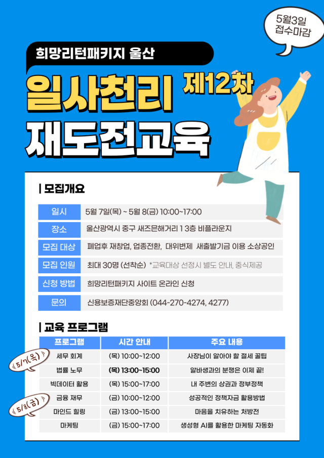 - 세무, 마케팅, 법률, 노무, 상권분석, 빅데이터, 마인드 힐링 등 6가지 과목으로 이루어진 본 과정을 통해