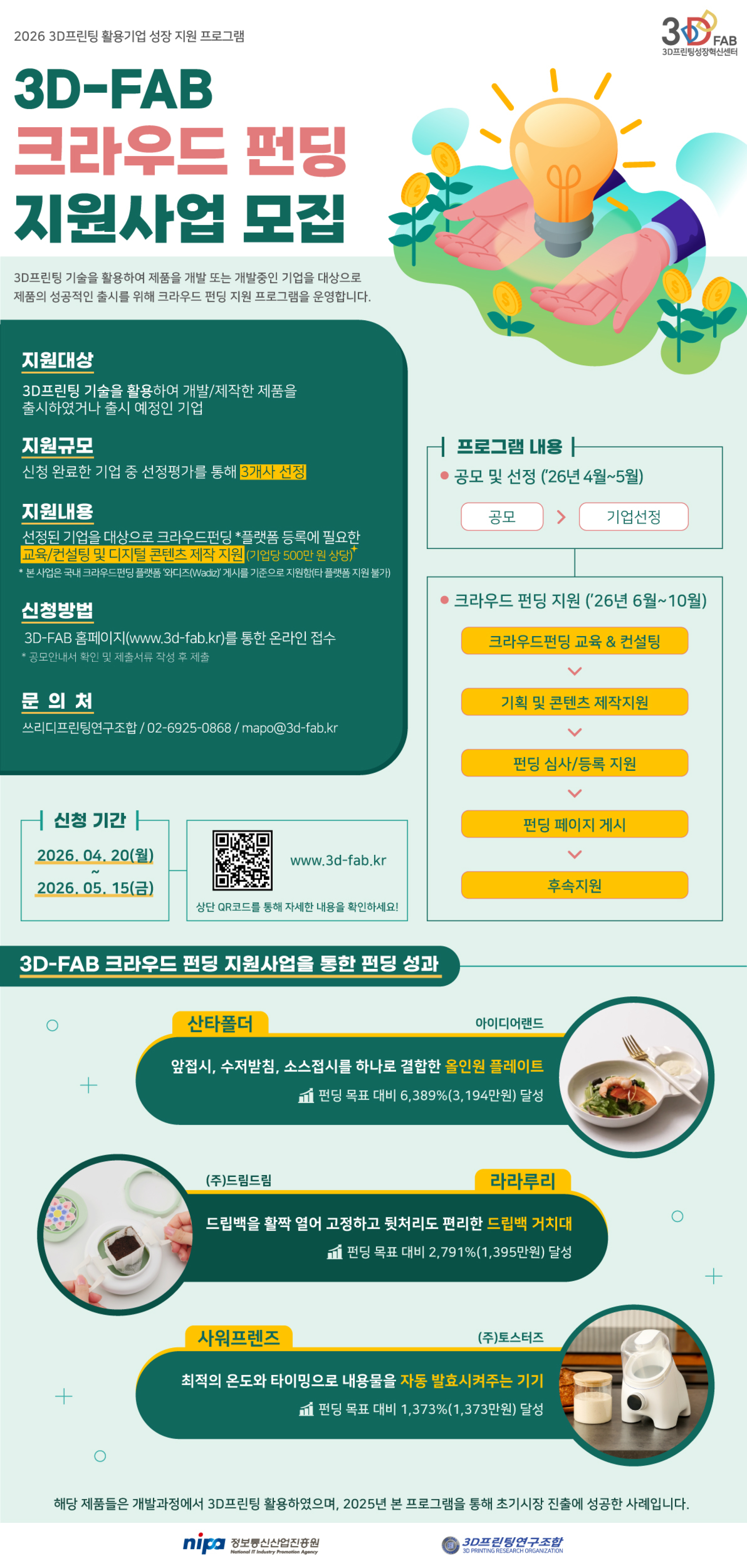 '26년 3D-FAB 크라우드펀딩 지원사업을 시행하오니,