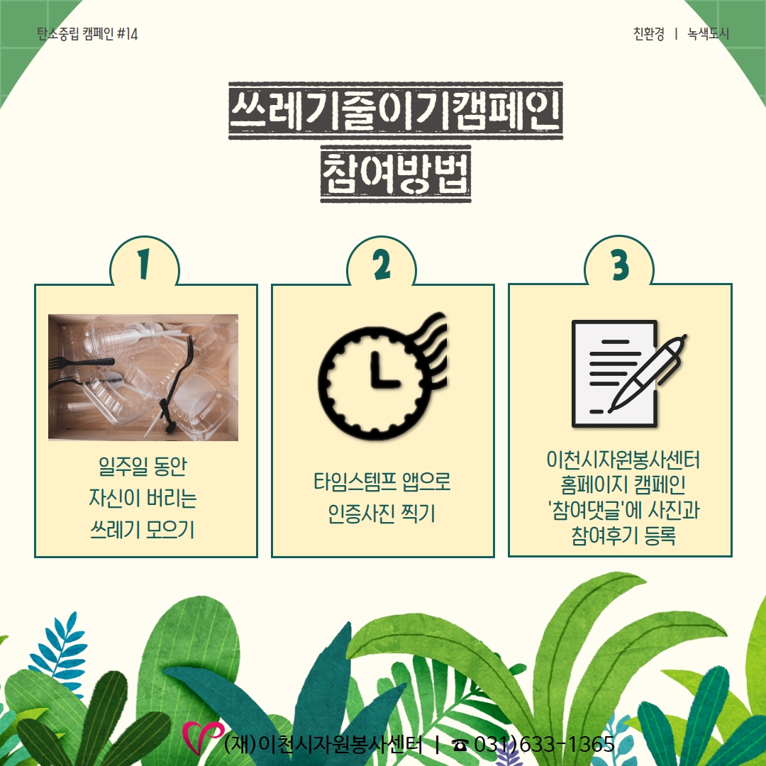 ○ 참여방법 : 일주일 동안 버리는 쓰레기 타임스템프 앱으로 인증사진 촬영 후 이천시자원봉사센터 홈페이지 캠페인 '참여댓글'에 사진과 참여후기 등록