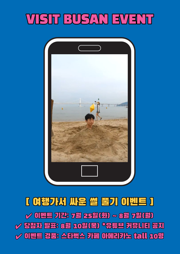 - 비짓부산 유튜브 채널 구독 + 현실심즈 해변 데이트 하다가 생긴 일 영상 좋아요 + 여행 중 싸운 썰 댓글 작성