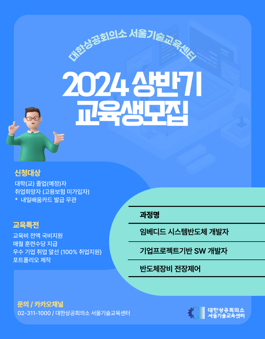 - 대한상공회의소 서울기술교육센터에서 2024년도 상반기 교육과정 훈련생을 모집합니다.
