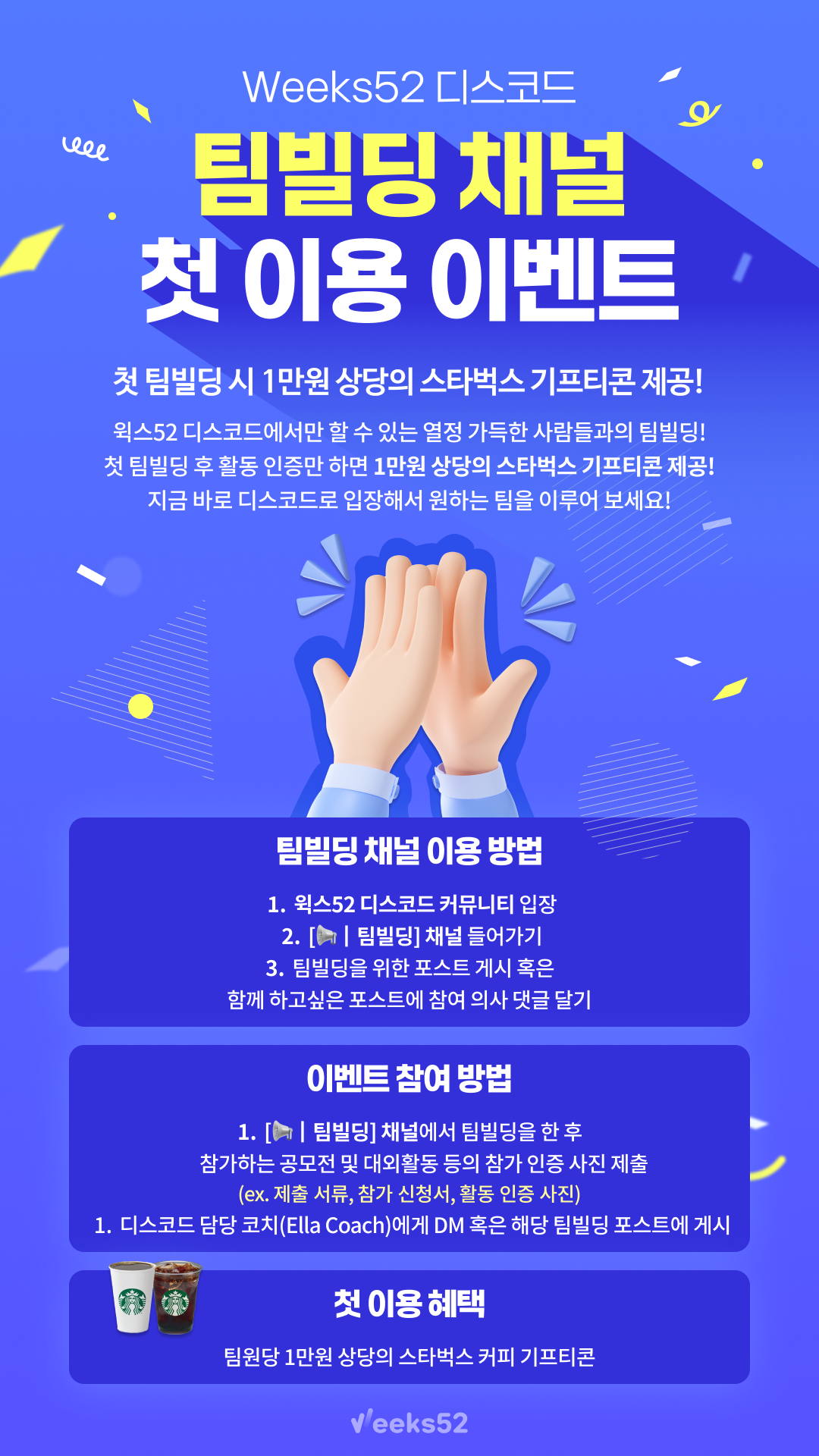 [Weeks52] 갓생러들과 팀빌딩 할 수 있는 커뮤니티_처음 이용하면 1만원 상당의 스타벅스 기프티콘까지?!