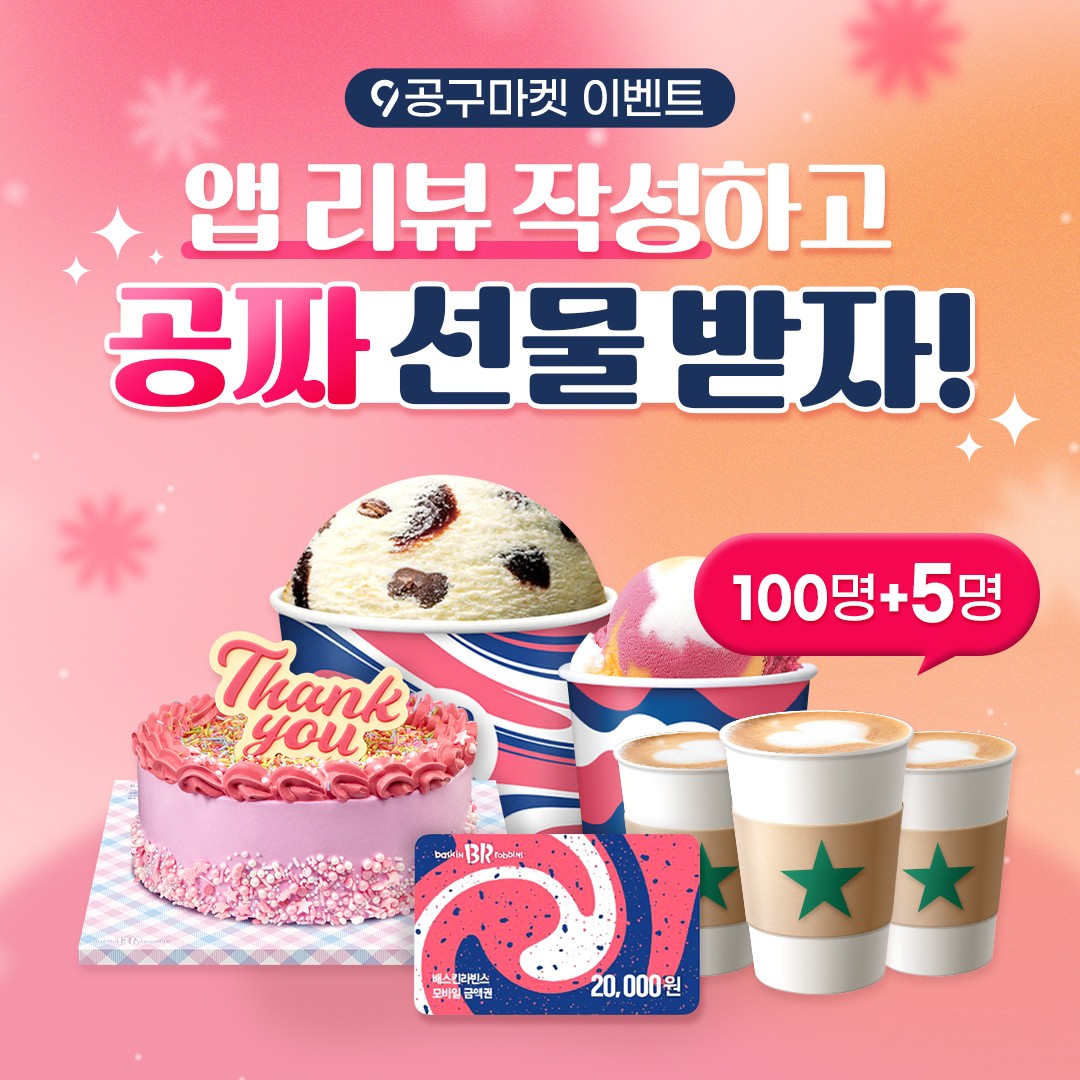 구글 플레이스토어 또는 앱스토어에 공구마켓 앱 리뷰를 남겨주시면 추첨을 통해 105분에게 푸짐한 선물을 드립니다.